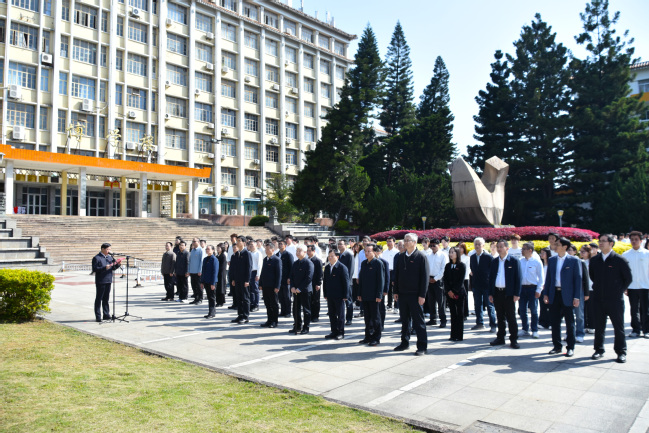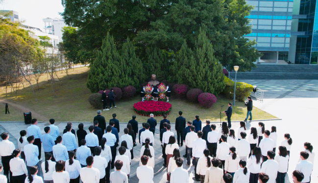 在逸夫图书馆严家显铜像前,校领导、机关有关部门负责人、新入职专任教师、辅导员和学生代表近百人在严家显铜像前整齐列队,鞠躬致敬,追思缅怀。赖海榕、兰思仁代表学校敬献花篮,整理绶带,并深深三鞠躬,深切缅怀福建省立农学院首任院长、著名昆虫学家、农业教育家严家显先生为福建高等农业教育和开云网页版事业所作出的重大贡献。