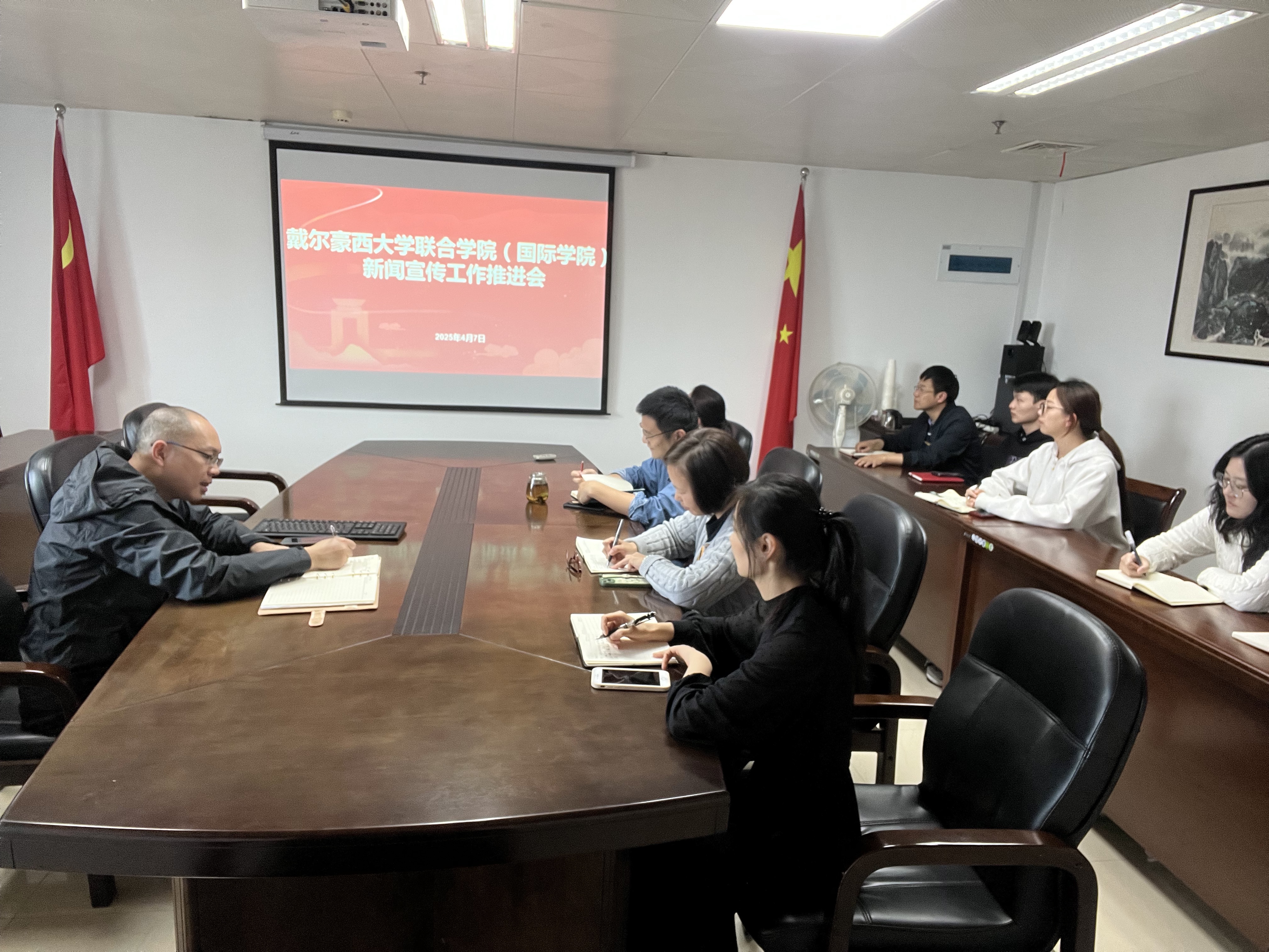 4月7日,戴尔豪西大学联合学院(国际学院)在综合楼901召开新闻宣传工作推进会,旨在进一步提升学院宣传工作质量,为学校争创“双一流”提供有力支持。此次会议紧扣学校相关工作要求,明确提出打造“高端”“具体”“生动”宣传的目标,强调全员参与、创新宣传方式的重要性。学院各科室负责人、全体辅导员参会,会议由院党委副书记刘敏主持。