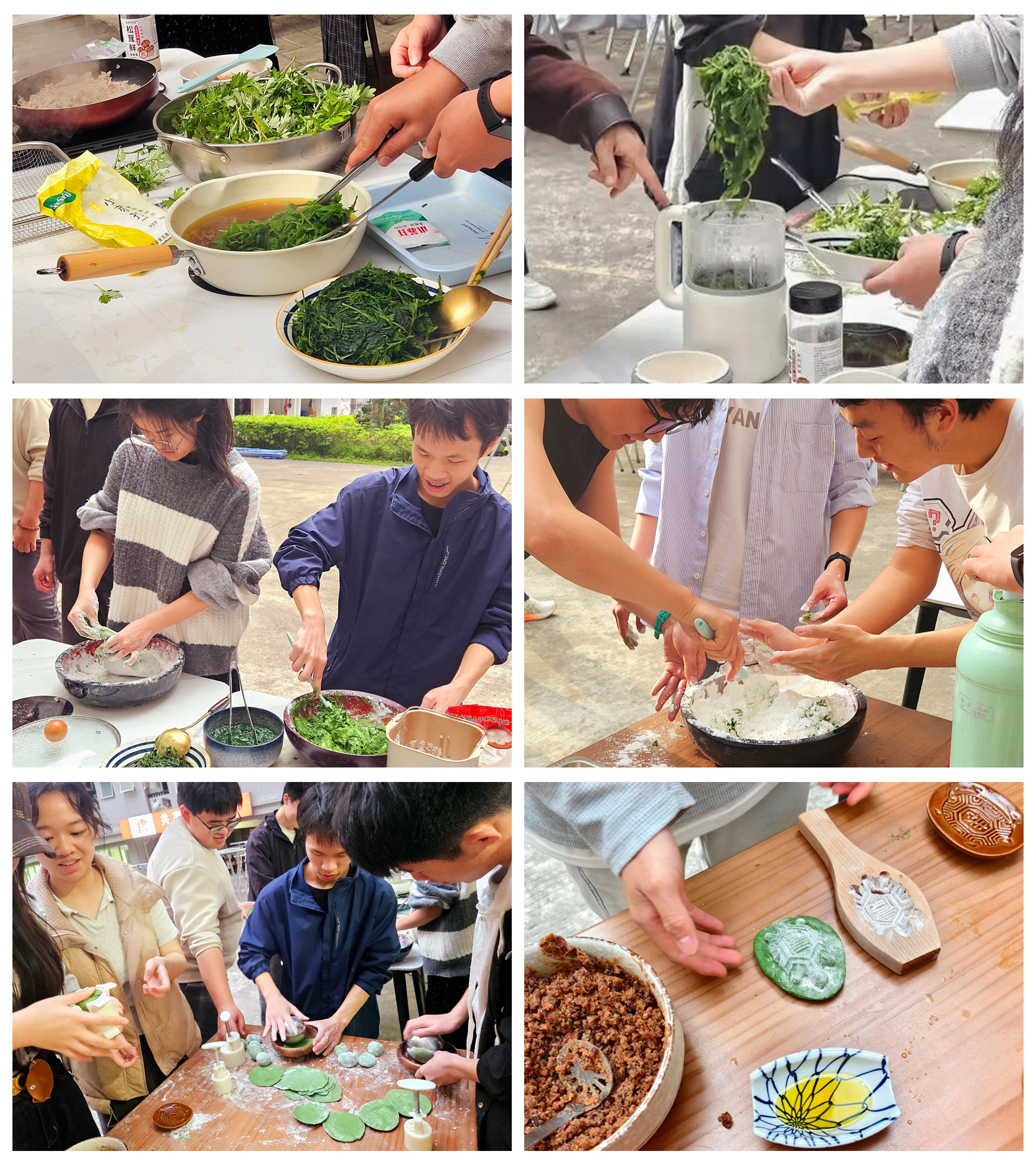 踏青寻青采青后,众人齐聚在北苑“一站式”学生社区青果助力站,开启了制作青团的环节。现场准备了糯米粉、豆沙馅等丰富的材料。同学们将艾草、鼠曲草、苎麻叶洗净后放入加了少许小苏打的沸水中焯煮3至5分钟,随后捞出放入破壁机打成细腻的草泥。接着将糯米粉、草泥以2:1的比例混合,缓缓倒入开水,边倒边搅拌成絮状,再用手揉成光滑不粘手的绿色面团。关于馅料,现场准备了甜味的豆沙馅和咸味的猪肉香菇笋丁馅。关于垫料,同学们将采摘的良姜叶和芭蕉叶洗净切割成十厘米左右见方的小片。制作青团时,大家将揉好的面团分成小块,搓圆、压扁,包入馅料,再像包汤圆一样,小心翼翼地收口搓成圆球形,再放入各样模具中压制成型,有圆团形、月饼形、乌龟形、宝塔形等。将它们两面涂抹茶油后摆放在垫料上,以防止粘连。尽管手法有生涩有熟练,但每个人都带着对春日和传统的热爱全情投入,现场欢声笑语不断。