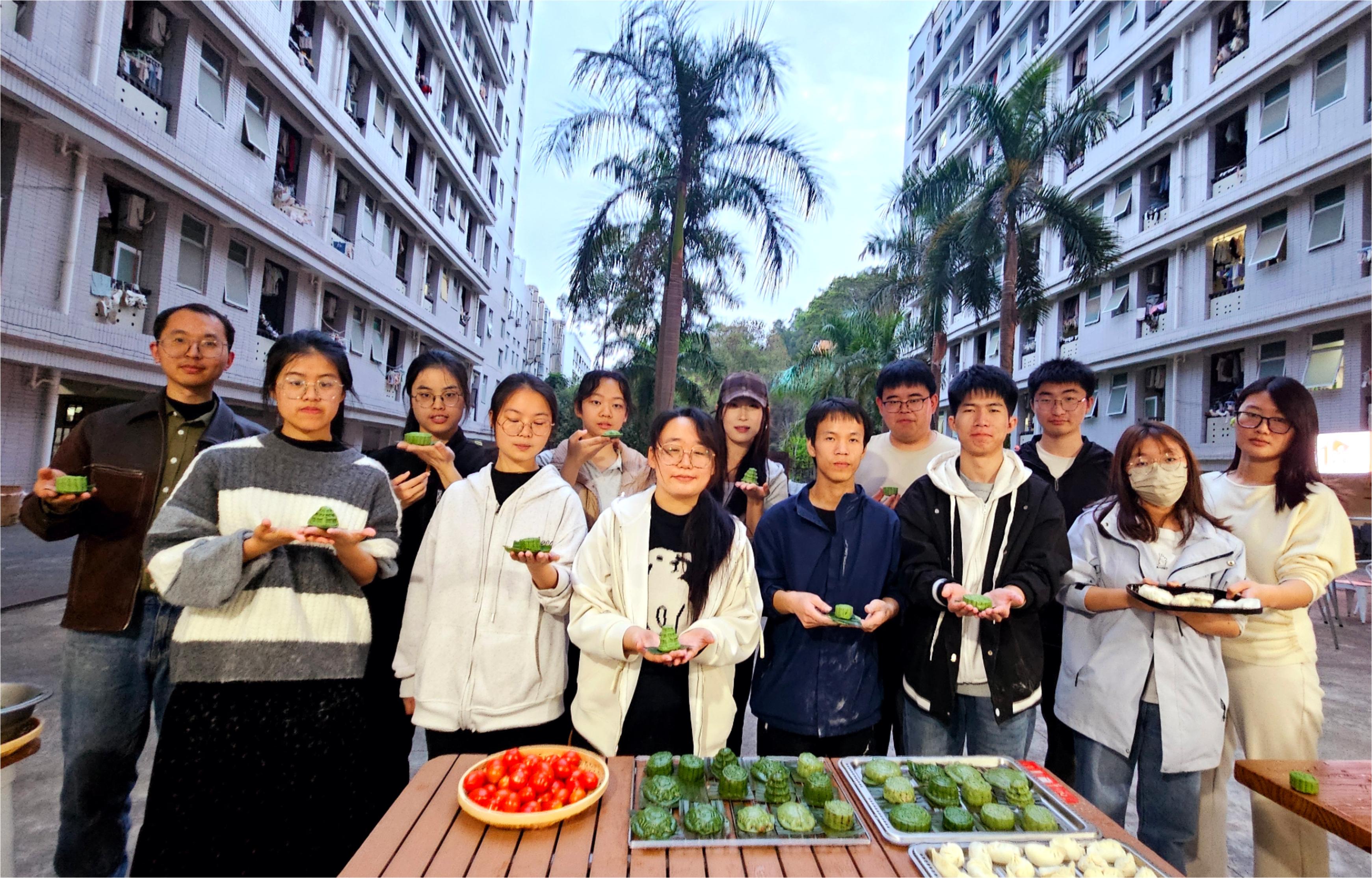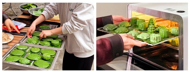 经过一段时间的忙碌,一个个造型别致、油绿如玉的青团摆满了桌面。随后,这些青团被放入蒸箱蒸10至12分钟。伴随着蒸箱中飘出阵阵热气,浓郁的艾草香与糯米香弥漫开来,大家纷纷围拢过来,期待着自己的劳动成果。新鲜出炉的青团,变得更加油亮碧绿,令人垂涎欲滴。同学们迫不及待地品尝着自己亲手制作的青团,美味的馅料在口中散开。现场还贴心准备了手包饺子、手搓糍粑、百香果蜂蜜水等,同学们吃得不亦乐乎,满满的都是幸福与满足。