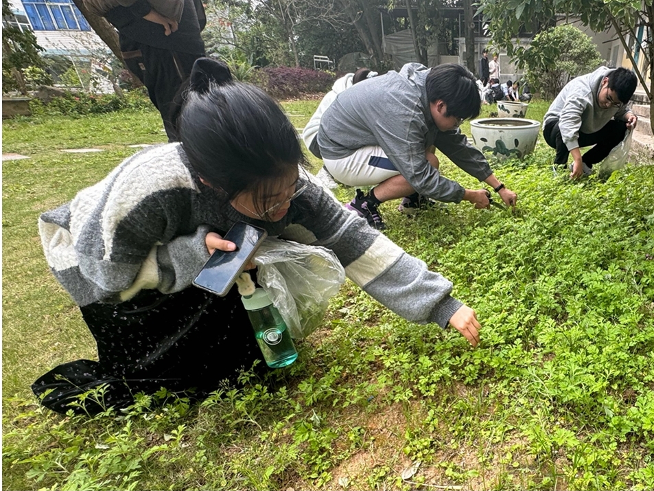 活动当日,阳光明媚,春风拂面,正是踏青的好时节。同学们沿着“青果-北山-中华园-青果”的路线踏青,在山间路旁寻找制作青团的关键食材——艾草、鼠曲草、苎麻。“艾草叶片呈羽状分裂,鼠曲草叶片呈匙形,苎麻叶片呈心形。”曾老师向同学们介绍道,“它们虽然形态各异,但共同的特征是叶片背面密被白色绵毛,这正是青团口感筋道的纤维来源。此外,苎麻的茎秆韧皮纤维还可以织成苎麻布,透气抗菌。”同学们仔细辨认它们的模样,亲手采摘其嫩枝叶。同时,同学们还采摘了良姜叶和芭蕉叶作为青团垫料。众人信步而行,沉醉于踏青的悠然意趣之中。沿途,大家纷纷讲述起各自家乡在清明时节的传统习俗,或庄重肃穆的祭扫仪式,或别具风情的清明游戏,或美味可口的清明小食。在这交流的过程里,同学们感受到大自然与传统文化之间的紧密关联,也深切领略到传统习俗的独特魅力与深厚底蕴。