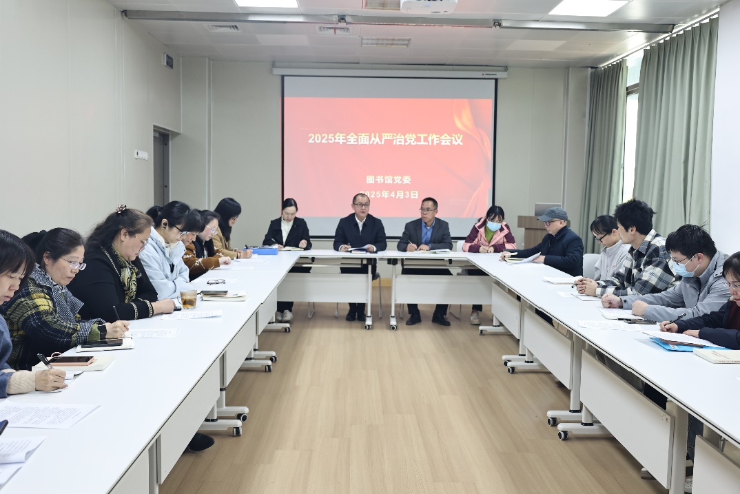 4月3日下午,图书馆党委在逸夫馆会议室召开2025年全面从严治党工作会议。图书馆、信息中心领导班子成员、纪委书记、各党支部书记、支委、各部室负责人及重点岗位相关人员参加会议。会议由图书馆党委副书记(主持工作)叶扬捷主持。