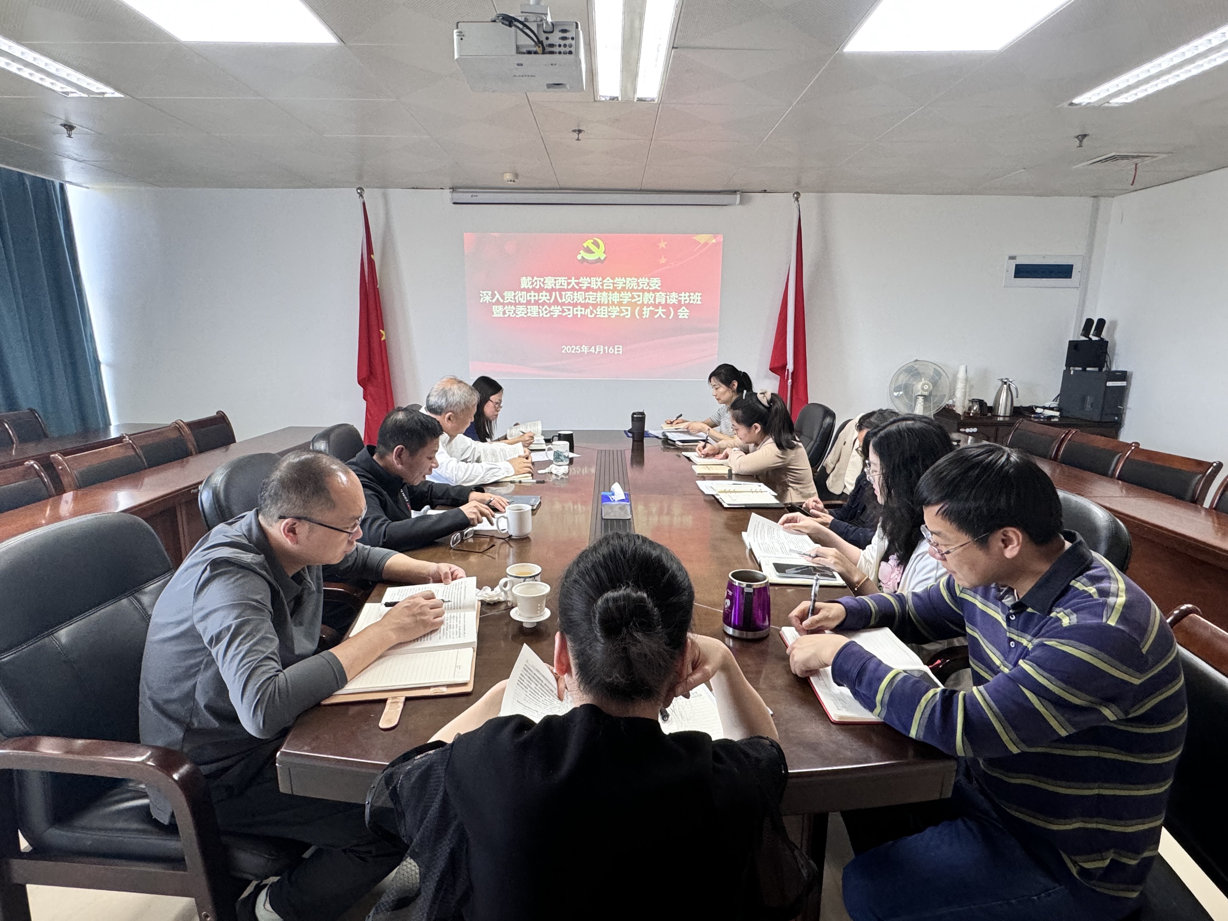 4月16日上午,戴尔豪西大学联合学院党委举行深入贯彻中央八项规定精神学习教育读书班暨党委理论学习中心组学习(扩大)会,学院领导班子成员、党委委员、纪委委员及党支部书记参加学习,院党委书记林平主持会议。