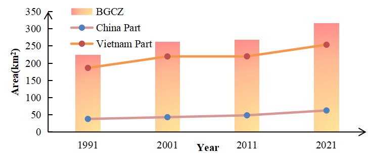图2. 1991—2021年中越跨境北部湾地区红树林面积变化