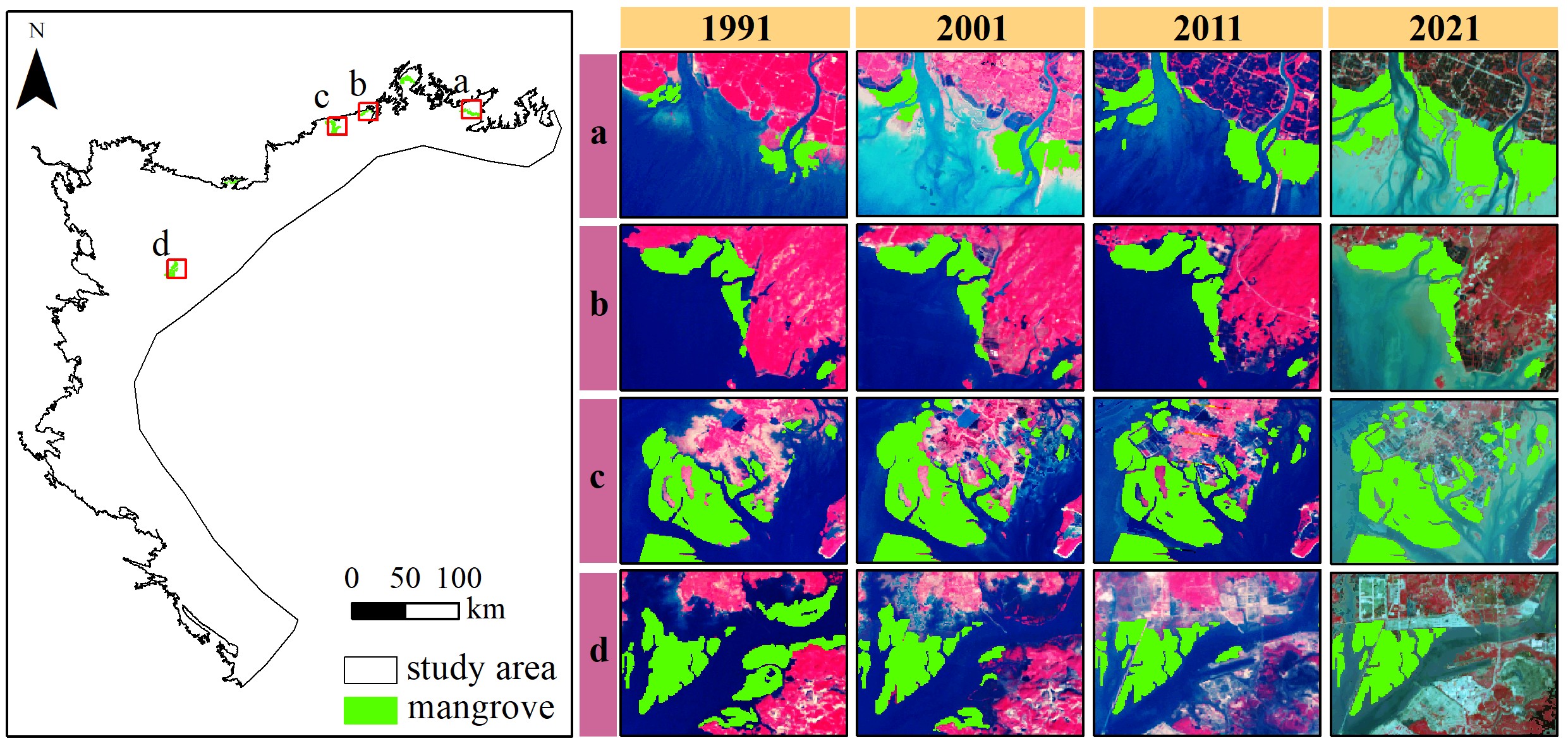 图3.1991—2021年中越跨境北部湾地区典型区域红树林时空动态