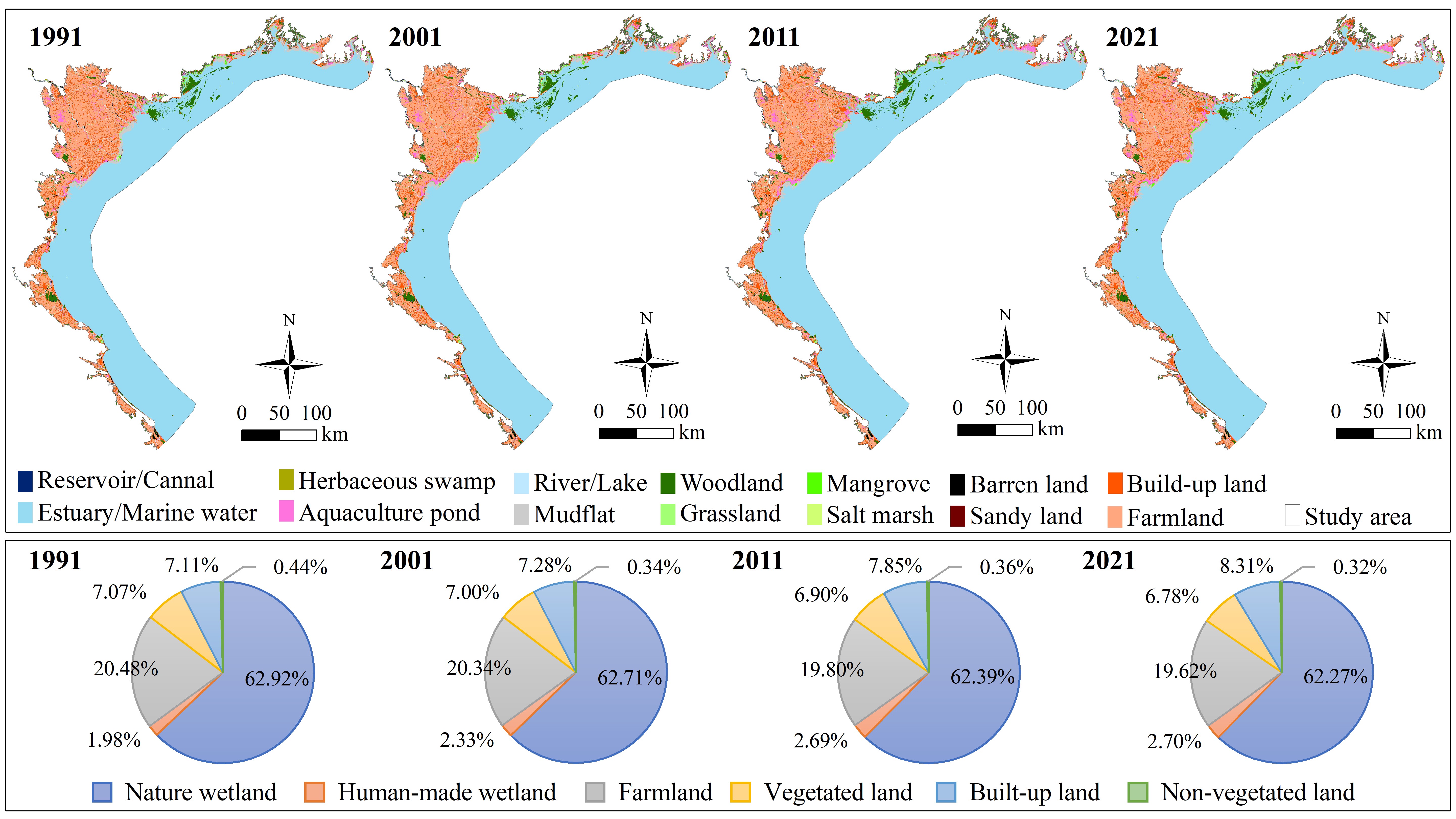 基于1991—2021年Landsat TM/OLI遥感影像和面向对象—DeepLabV3+深度学习分类方法,实现中越跨境北部湾地区的土地覆盖分类,并结合土地覆盖变化、景观指数和空间分析定量评估红树林的时空动态。结果表明,面向对象深度学习分类方法显著提高了分类结果的精度和完整性。在1991—2021年期间,北部湾海岸带地区的红树林面积增加92.11 km2,其中中国部分每年增加0.82 km2,越南部分每年增加2.25 km2。中国和越南部分的红树林连通性均有所改善,但越南部分的干扰程度比中国部分更为显著。红树林的动态变化受众多因素影响,水产养殖是导致北部湾地区红树林破碎化的首要原因。中国和越南不同的管理机制以及沿海地区的发展模式对红树林的时空演变具有重要影响。本研究为未来跨境区域红树林的保护和管理提供了重要的科学依据。