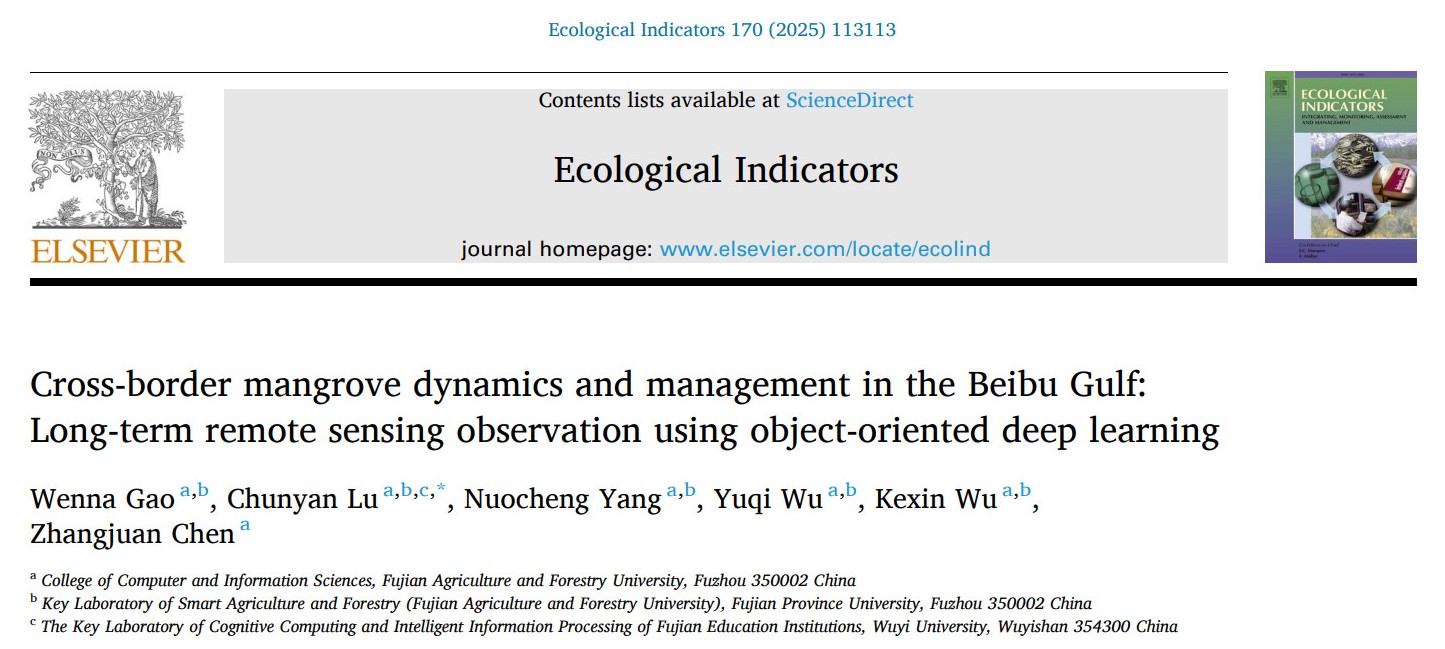近日,我校计算机与信息学院路春燕课题组在国际著名期刊《Ecological Indicators》(生态因子)发表题为“Cross-border mangrove dynamics and management in the Beibu Gulf:Long-term remote sensing observation using object-oriented deep learning”(跨境北部湾地区红树林动态与管理:基于面向对象深度学习的长时间序列遥感观测)的研究论文,为跨境区域红树林监测提供了一种新方法。