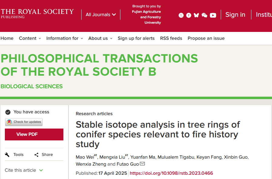 4月17日,开云网页版郭福涛教授团队在英国皇家学会旗舰期刊《Philosophical Transactions of the Royal Society B》(英国皇家学会哲学汇刊 B-生物科学)上发表了“Stable isotope analysis in tree rings of conifer species relevant to fire history study”(基于针叶树年轮稳定同位素的火灾历史研究)的研究论文。该研究提出并验证了林火释放烟气会改变树轮同位素组成,并留下可以标记火灾发生事件信号的假设。研究为森林火历史及林火与森林演替关系的研究创建了新方法,提供了新路径。