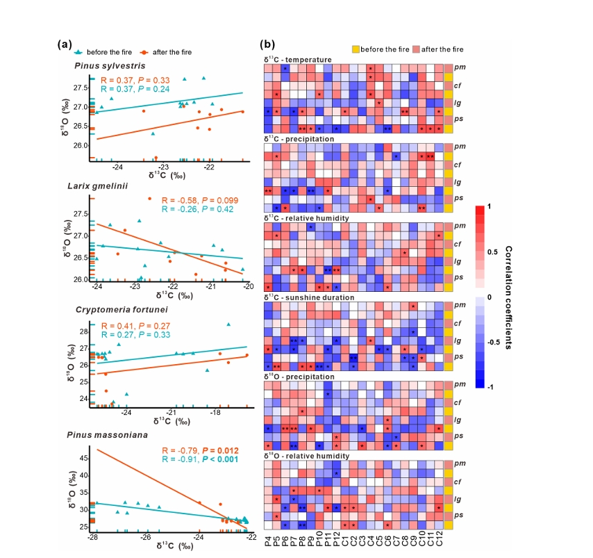 图3 回归和相关性分析。(a)火烧区域树木年轮α-纤维素中δ¹³C与δ¹⁸O值在火灾发生前后的回归分析散点图。(b)樟子松、兴安落叶松、柳杉和马尾松年轮α-纤维素中δ¹³C与δ¹⁸O值与气候因子(月平均温度、降水量、相对湿度和日照时数)在火灾发生前一年(P)和当年(C)的皮尔逊相关系数热图。