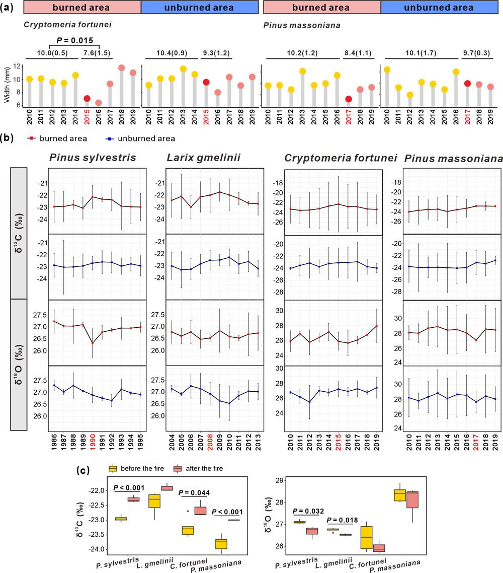 图2 树木年轮的径向生长和同位素分析。(a)在火烧区和未火烧区,柳杉和马尾松在研究期间10年的年轮宽度生长情况。(b)在火烧区和未火烧区,樟子松、兴安落叶松、柳杉和马尾松在研究期间10年的α-纤维素中的δ¹³C和δ¹⁸O值。(c)火烧区火灾前后δ¹³C和δ¹⁸O含量的箱线图。