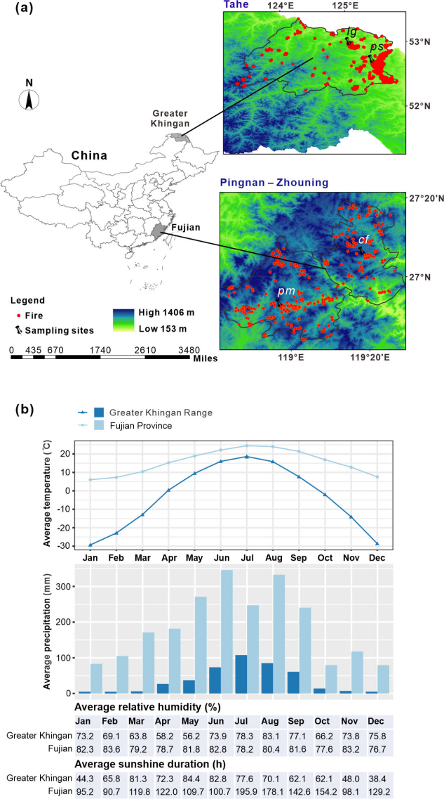 图1 采集木材样本的研究地点。(a)在中国大兴安岭地区和福建省分别采集樟子松、兴安落叶松、柳杉和马尾松树轮样本。(b)研究期间10年的月平均温度、降水量、相对湿度和日照时数。
