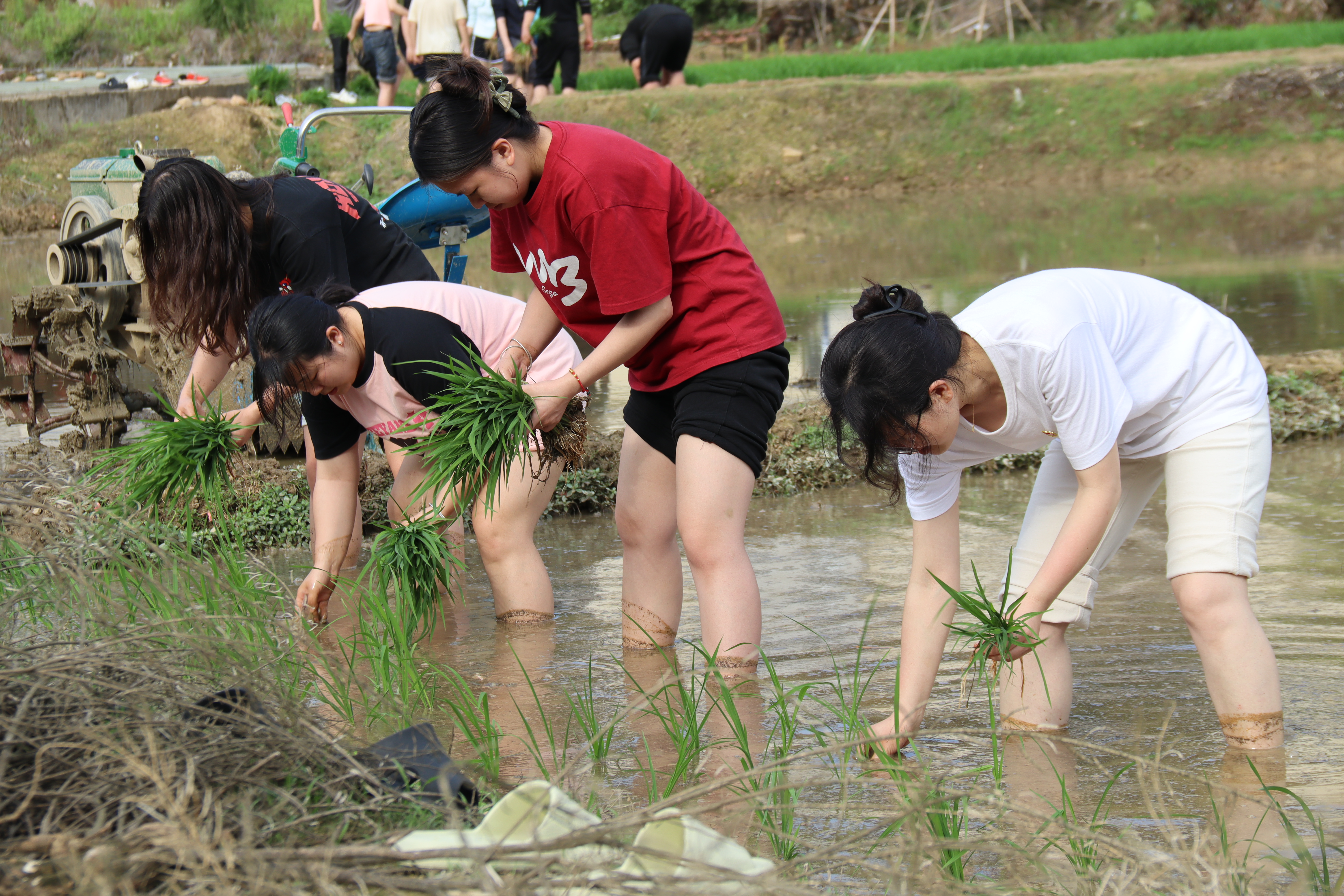 在深入调研乡村发展成果后,学员们脱下鞋袜、卷起裤脚,走进田间地头。“秧苗左手分、右手插,间距保持20厘米!”在益坑村种植示范区,农事员手把手教学员们插秧。师生们躬身入局,泥水没过脚踝,青苗依次成行。“这是我第一次真切感受到‘汗滴禾下土’的分量。”00后党员程悦灵抹着汗说。这场农耕实践让课本里的“农民主体地位”理论落地生根,也在青年学子的白衬衫上印下了乡村振兴最生动的注脚。