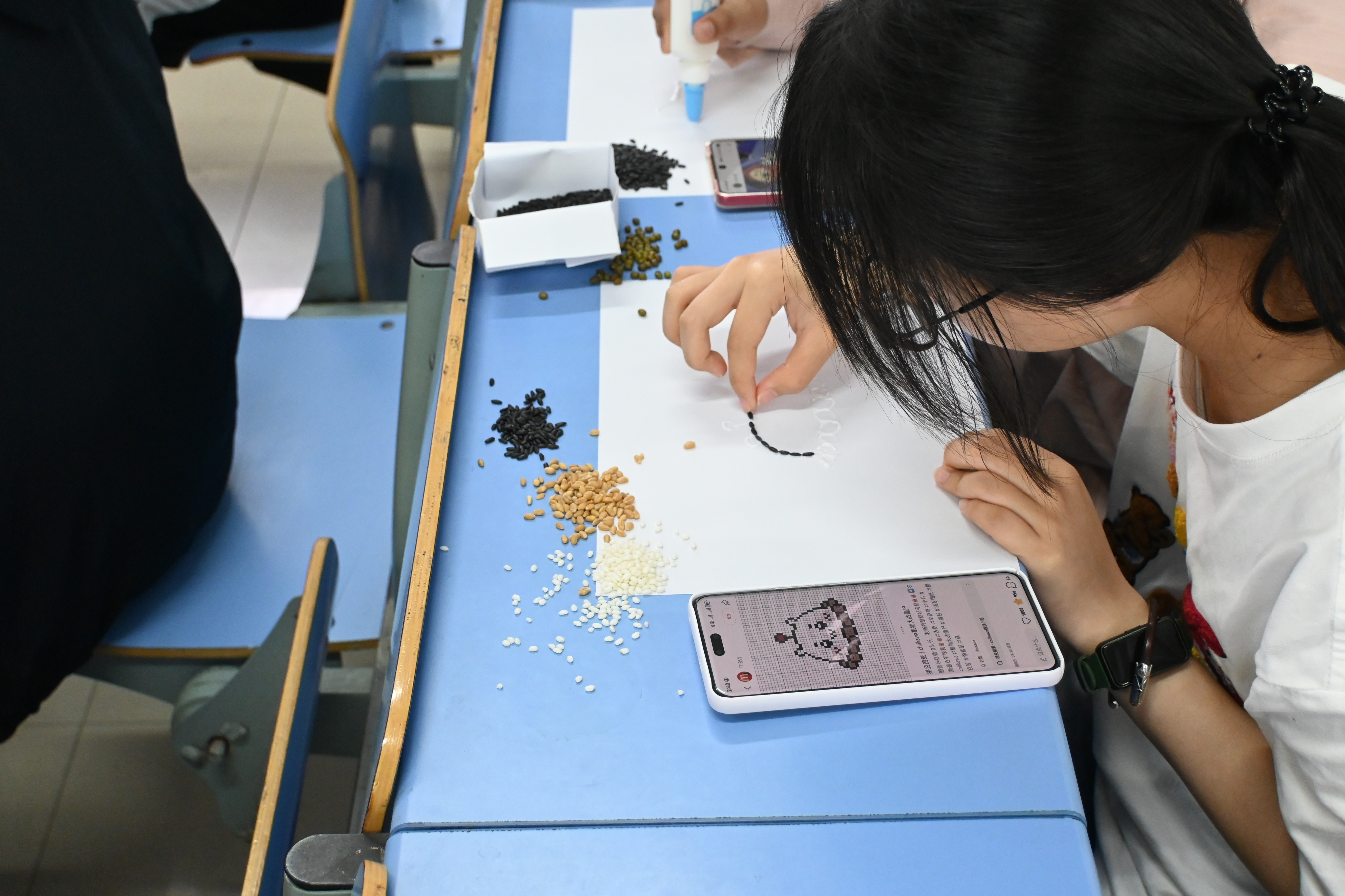 活动现场,同学们领取了由主办方精心准备的各种植物种子、胶水、画板等材料,在志愿者同学的指导下,将一粒粒形态各异的种子化作“颜料”,通过拼贴、组合、构图,在画板上勾勒出栩栩如生的自然图景。有的同学以种子模拟花瓣层叠的繁花,有的拼出田园风光的剪影,还有的创作出可爱的动漫人物。小小的种子在指尖被赋予新的艺术生命,展现出自然与人文交融的独特魅力。