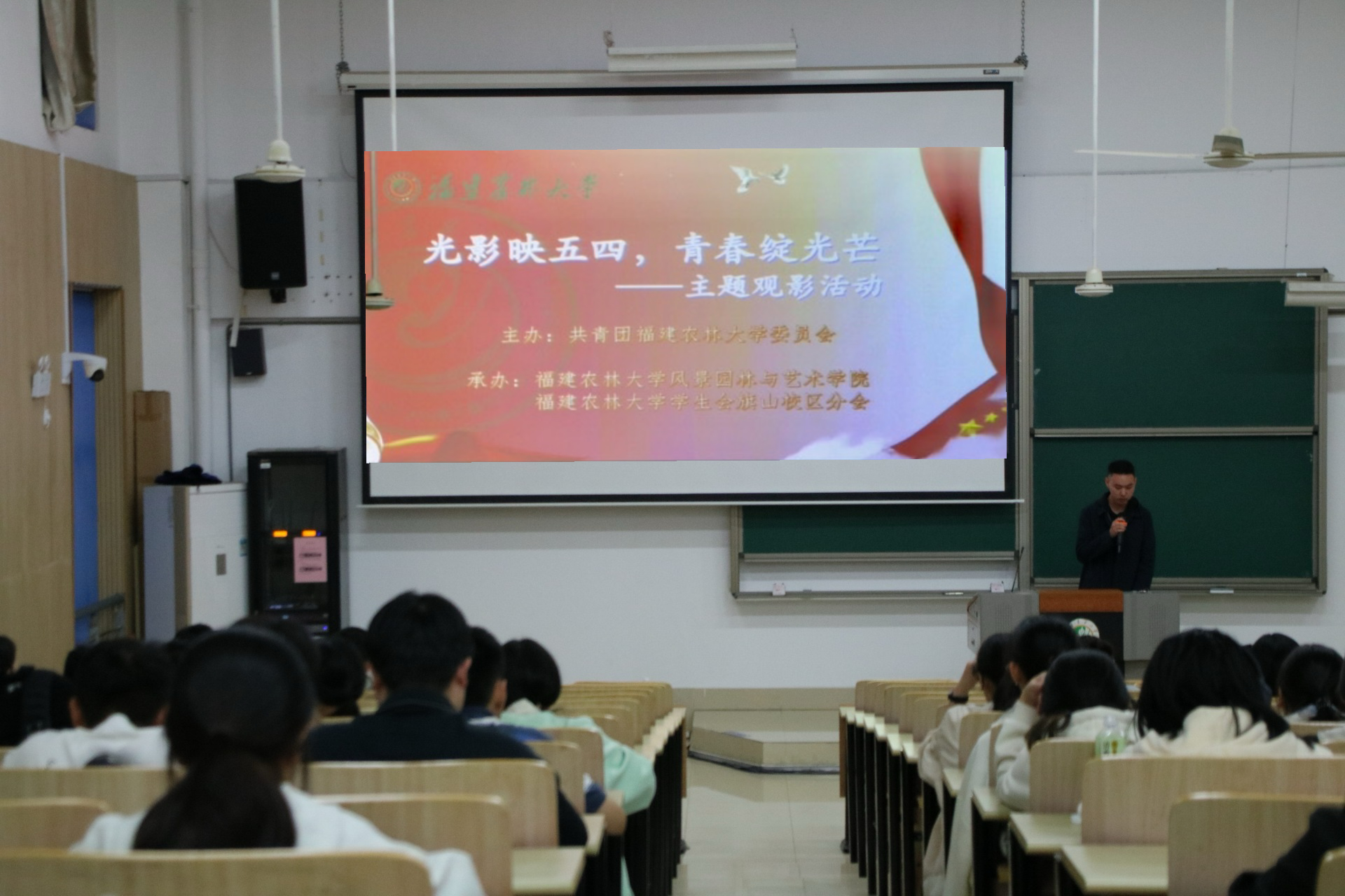 4月25日,风景园林与艺术学院于旗山校区旗教100教室举办五四青年节红色电影主题观影分享会。此次活动吸引了大约180名青年大学生参与。