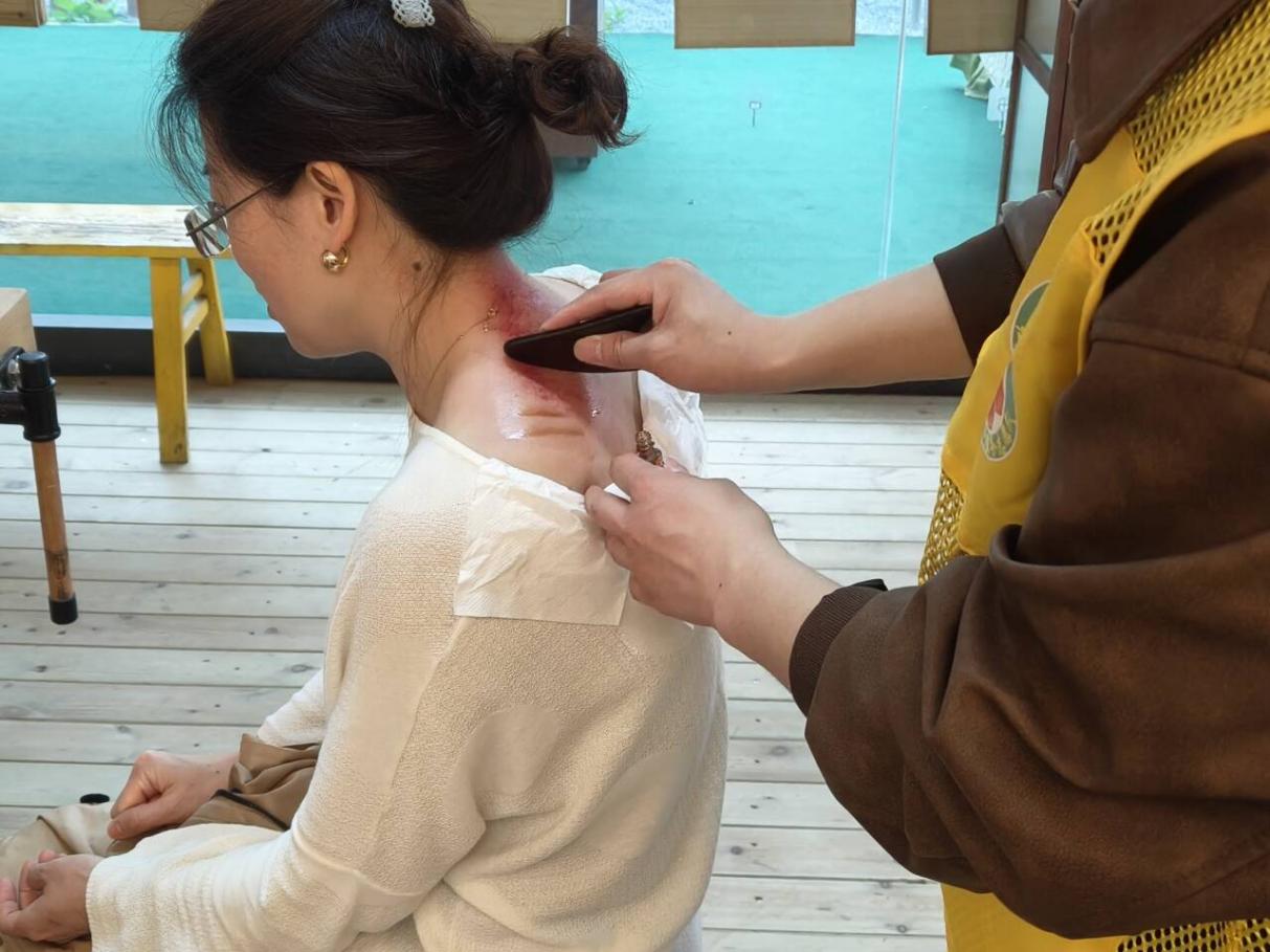 到场家长对蜂疗兴趣浓厚,纷纷排队体验,体验项目有基础的肩颈刮痧、腿、腰、手等部位的刮痧、拔气罐、耳疗等项目。志愿者边操作边解说,细心地从部位的放松按摩开始,使肌肉彻底放松后使用神蜂精进行擦涂,用刮板在酸痛部位进行反复刮动,体验者皮肤局部出现红色粟粒状、斑块状等“出痧”变化,使体验者酸痛部位局部发热,帮助对神蜂精的吸收,从而达到活血透痧的作用。