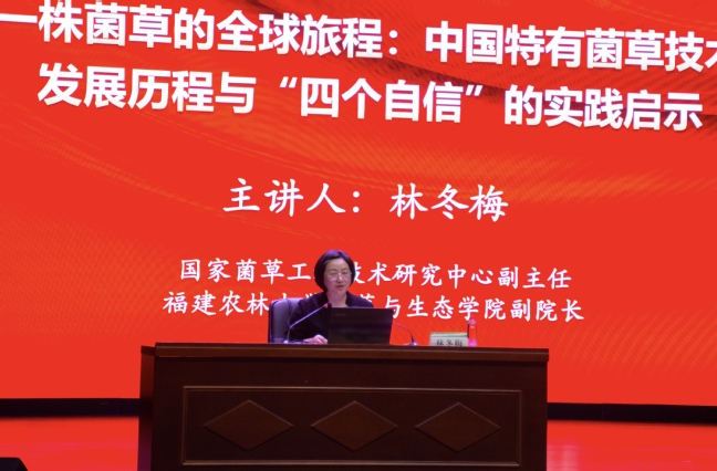 林冬梅以“一株菌草的全球旅程”为题,讲述了20余年来扎根菌草科研与援外一线的奋斗经历,从道路自信、理论自信、制度自信、文化自信“四个自信”的理论高度,为师生们带来了一场兼具家国情怀与全球视野的精彩讲座。她以菌草为媒,将菌草技术援外的中国故事娓娓道来,让“四个自信”理论更加生动可感。林冬梅表示,发展菌草事业,不仅是为民谋利的初心工程,更是为国争光的民族事业,是展现大国担当的国际事业。她指出,新时代的农林学子既要追求“顶天”的科研创新,更要做好“立地”的实践服务,让青春在服务国家战略中绽放光彩!从“菌草之父”林占熺到“菌草女儿”林冬梅,菌草精神的接力棒在一代代农林人手中传递。林冬梅的奋斗历程,既是她的真实写照,更是新时代中国科技工作者科技报国的生动教材。她的足迹印证了,中国的绿色智慧正通过菌草技术架起国际合作桥梁,为构建人类命运共同体贡献中国方案。