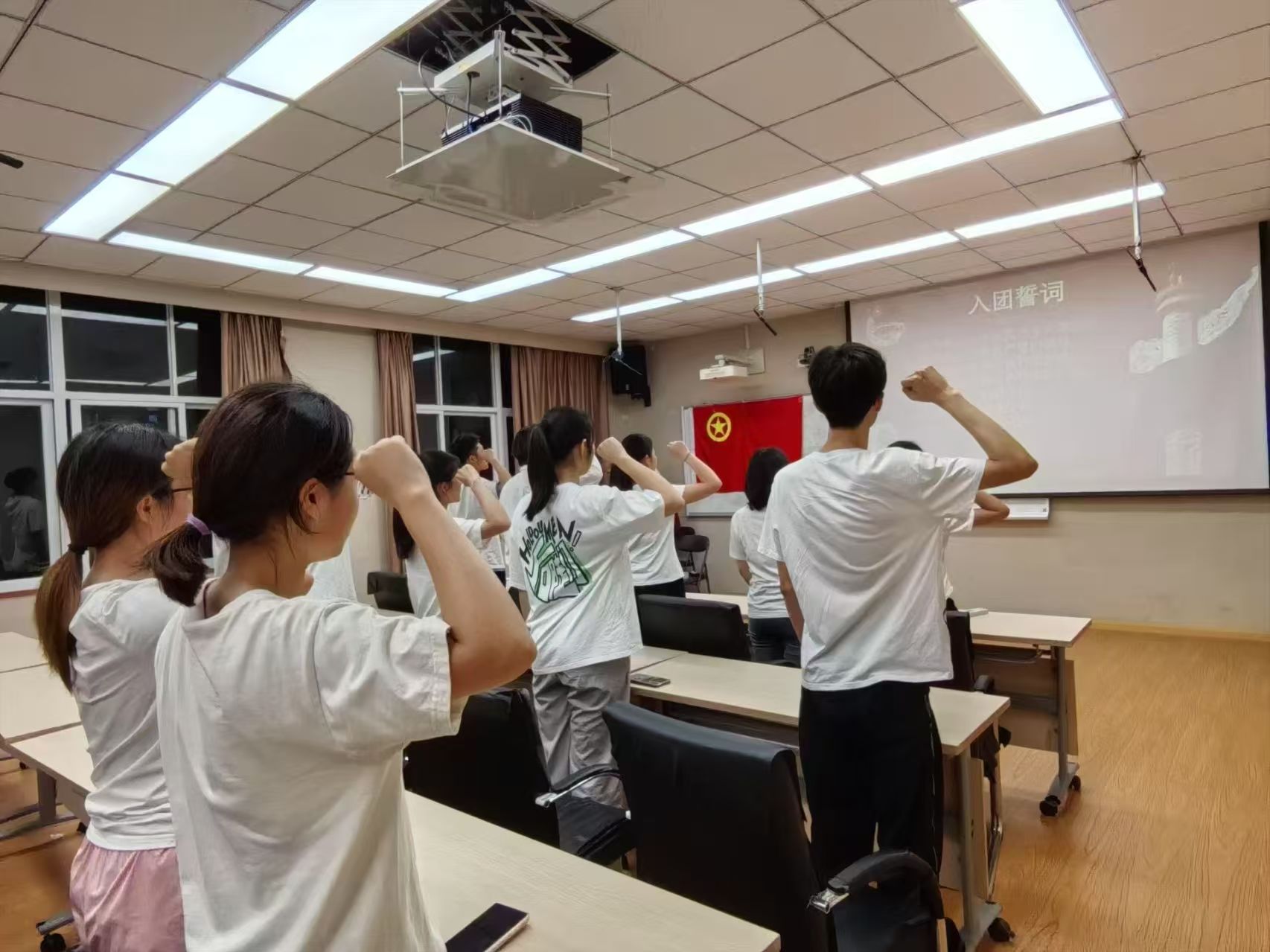 闪闪团徽映照青春脸庞,崭新团章承载光荣使命。4月22日学院于博学楼组织开展了重温入团仪式的活动。在此次入团仪式上,新老团员们身姿挺拔,目光坚定,右拳紧握高举,面向团旗齐声宣誓。铿锵有力的宣誓声响彻会场,那掷地有声的话语,是他们对中国共产主义青年团许下的忠诚承诺,更是要用一生去践行的信仰。青年团员们纷纷表示,将牢记"为共产主义事业而奋斗"的入团初心,以强农兴农为己任,用实际行动助力乡村振兴。
