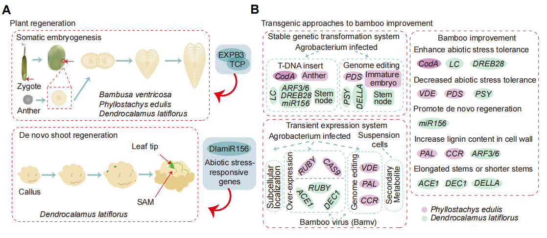 图4. 通过体细胞胚胎发生和从头芽器官发生(de novo shoot organogenesis)的竹子再生过程,以及遗传转化与基因组编辑技术在性状改良中的应用。