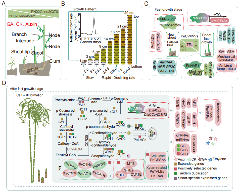 图1. 竹笋的快速生长、茎的成熟与结构强化的机制