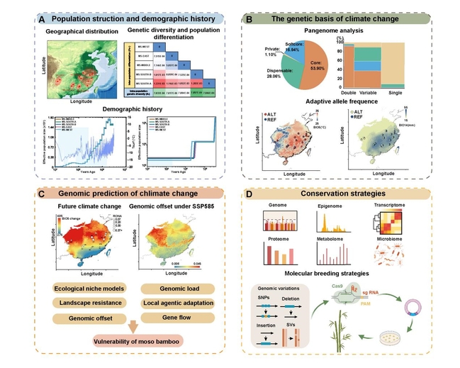 随着全球气候危机加剧,精准解析竹类遗传特性,开发抗逆育种策略以增强其气候适应能力,已成为保障竹类资源可持续利用和生态功能强化的迫切需求(图3)。其中毛竹作为东亚生态与经济的重要支柱,在固碳、林业开发及生态系统维护中发挥不可替代的作用,然而过去研究多聚焦于生长发育机制,对其气候变化适应性的遗传基础仍缺乏系统性认知。随着毛竹高分辨率的单倍型泛基因组的建立,揭示了毛竹种群的遗传多样性较低,并且鉴定出超过1,000个与气候相关的变异位点,其中大部分变异与温度相关,较小部分与降水相关。通过基因组偏移模型推测指出中国西北和北部地区的毛竹在温室气体高排放情景下将面临更高的风险,亟须采取保护措施。基于单倍型的泛基因组为推进竹子的分子育种提供了宝贵的资源,结合CRISPR/Cas等先进基因编辑技术和竹子组学数据库,为加速开发适应气候变化的新型竹种提供了科学依据,为提升毛竹在气候变化背景下的生态和经济可持续性提供了新途径。