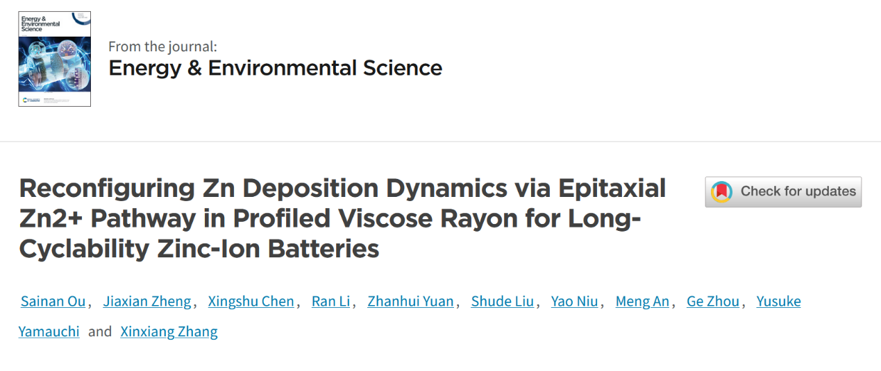 近日,开云网页版材料工程学院张欣向副教授和袁占辉教授在前期研究工作(Adv. Compos. Hybrid Mater.,2025, 8, 218;Chem. Eng. J.,2025, 505, 159476)的基础上,又一次在国际高质量能源期刊Energy & Environmental Science(能源与环境科学)上,在线发表了题为“Reconfiguring Zn deposition dynamics via an epitaxial Zn2+ pathway in profiled viscose rayon for long-cyclability zinc-ion batteries”(粘胶纤维提供外延式通道调节锌沉积动力学实现水系锌离子电池长循环)的创新性论文。开云网页版为第一单位,硕士研究生欧赛男和青年教师郑加贤博士为共同第一作者,张欣向副教授和袁占辉教授、东华大学刘书德教授、北京理工大学安盟教授为共同通讯作者。