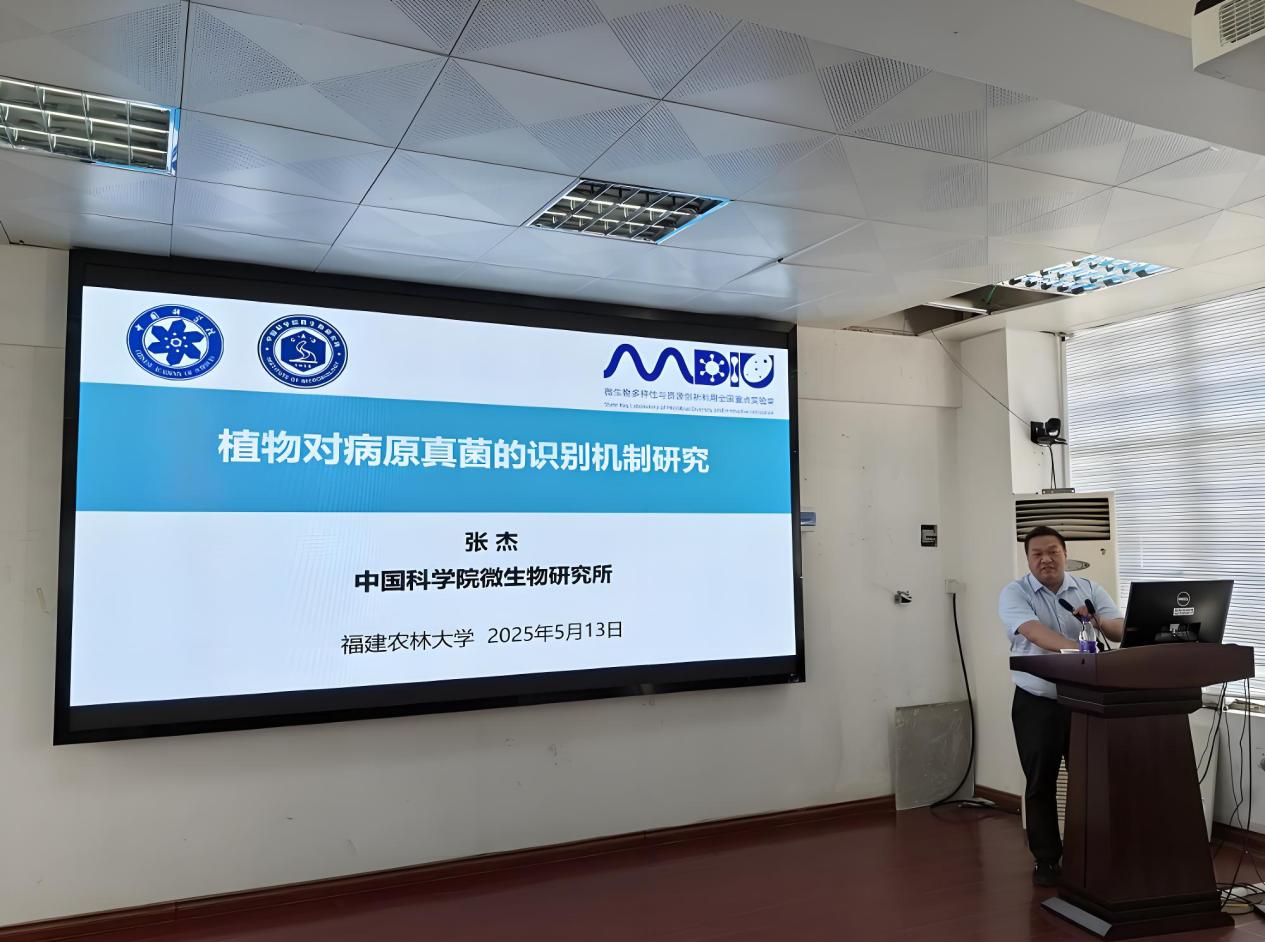 张杰研究员以“植物对病原真菌的识别机制研究”为题,系统阐释了植物与病原真菌互作的前沿进展,重点分享了其实验室在植物先天免疫受体识别病原真菌分子机制方面的突破性发现。他结合分子生物学、遗传学及微生物组学技术手段,揭示了植物通过多层次识别系统抵御病原真菌侵袭的分子路径,并探讨了如何通过改造植物免疫网络提升作物抗病性的应用前景。报告深入浅出,既有理论深度又具实践启发性,现场师生就植物免疫信号传导、抗病育种策略等问题与张杰研究员展开了热烈讨论。