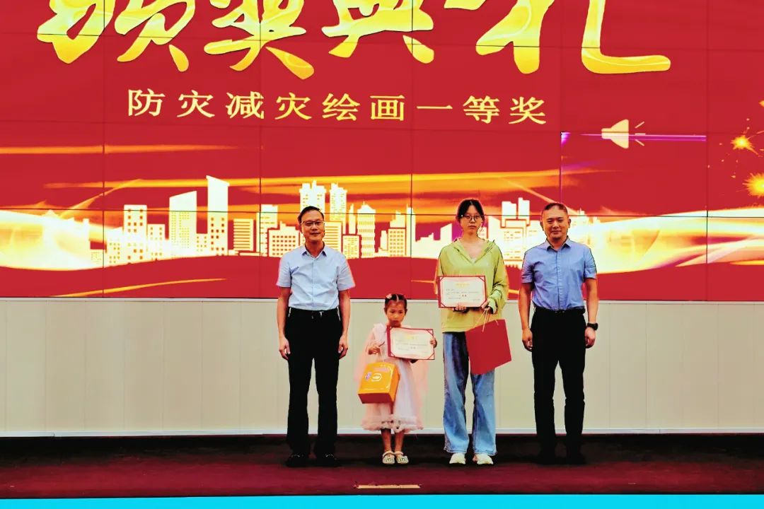 市地震局副局长、三级调研员叶威,县委常委、县政府常务副县长王礼藕为防震减灾绘画比赛一等奖获得者颁奖