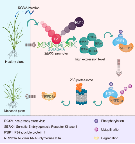 RGSV是一种广泛分布于水稻种植区的病毒,能够导致水稻矮化分蘖急剧增多、叶片黄化并伴有类病斑等,严重影响水稻的生长和发育,导致水稻绝收。2020年,该课题组曾在《Molecular Plant》报道RGSV编码的P3蛋白通过诱导一个E3泛素连接酶P3IP1,从而靶向并降解RNA聚合酶 Ⅳ(Pol Ⅳ/NRPD1a),首次揭示了病毒利用泛素化系统破坏水稻RdDM抗病毒机制的策略。此次发表的新研究延续了之前的研究,进一步揭示了P3上游诱导机制,深化了对其作为病毒“分子兵器”的系统理解。