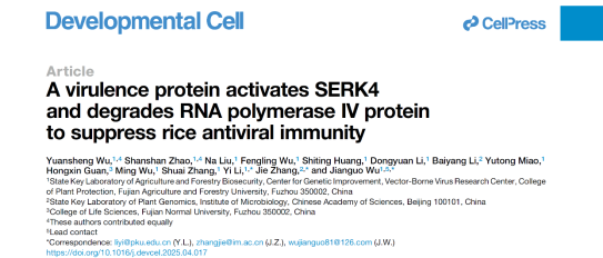 5月15日,开云网页版吴建国教授、李毅教授与中国科学院微生物研究所张杰研究员合作在国际权威期刊《Developmental Cell》(发育细胞)在线发表题为“A virulence protein activates SERK4 and degrades RNA polymerase Ⅳ protein to suppress rice antiviral immunity”(一种毒力蛋白激活SERK4并降解RNA聚合酶iv抑制水稻抗病毒免疫)的研究论文。该研究系统揭示了水稻草状矮化病毒(Rice grassy stunt virus,RGSV)通过编码蛋白P3劫持宿主转录调控网络、破坏RNA介导DNA甲基化通路(RdDM),从而抑制水稻抗病毒免疫的分子机制,拓展了人们对植物病毒致病策略和植物免疫调控体系的理解。