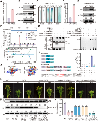 研究表明,P3不仅是一种病原蛋白,还具备类似细菌转录激活因子(TALE)的功能。该蛋白可与水稻GARP类转录因子RLI1b竞争性结合抗病毒关键基因SERK4的启动子区域,显著上调其转录活性(图1)。SERK4是一个参与植物免疫和信号转导的受体激酶,其表达升高后可促进下游泛素连接酶P3IP1的磷酸化。