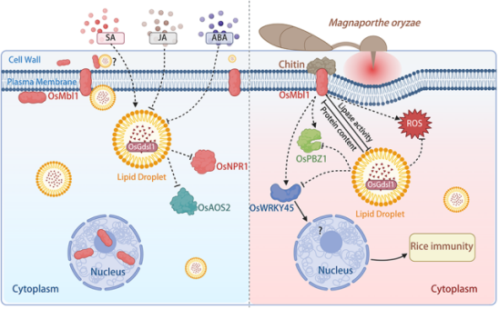 研究揭示了凝集素蛋白OsMbl1对GDSL脂肪酶的调控作用,当稻瘟菌侵染时,OsMbl1通过抑制OsGdsl1的脂肪酶活性,正向调控水稻免疫应答,从而增强宿主对病原菌的抗性。该研究创新性阐释了植物凝集素调控GDSL脂肪酶活性的分子机制,不仅拓展了植物先天免疫调控网络的理论认知,更为创制抗稻瘟病水稻新种质提供了重要靶标(图2)。