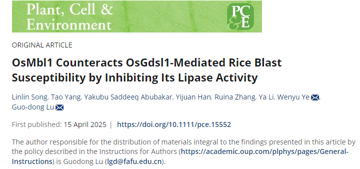 植物保护学院鲁国东教授团队在国际知名学术期刊Plant Cell & Environment《植物细胞与环境》在线发表了题为"OsMbl1 counteracts OsGdsl1-mediated rice blast susceptibility by inhibiting its lipase activity"的研究论文。该研究首次解析了GDSL脂肪酶OsGdsl1与凝集素蛋白OsMbl1的互作机制在水稻抗稻瘟病中的关键作用,为作物抗病育种提供了重要理论依据。
