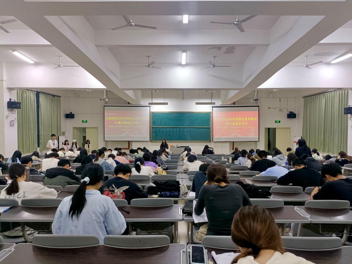 4月9日晚,在正式开课前,安溪校区于教学楼安100-1组织开展2026年国家公务员笔试模考。模考现场秩序井然,同学们很快进入考试状态,认真仔细作答,作答完成后有序交卷。笔试现场模拟了真实的考场环境,有助于同学们提前熟悉考试流程,针对理论知识进行查缺补漏。