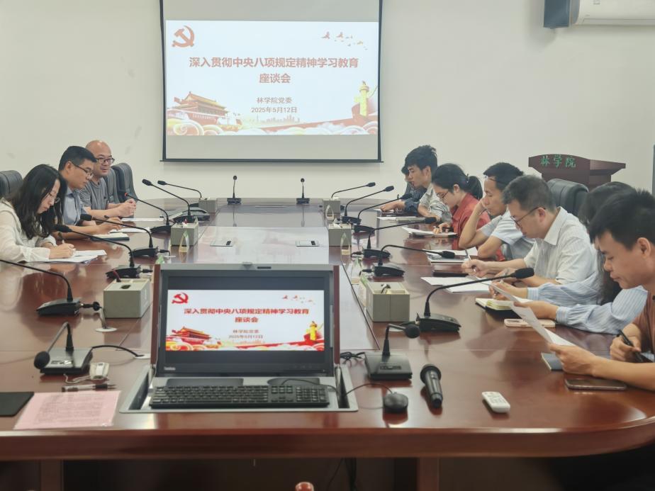近日,林学院党委在诚A206会议室召开深入贯彻中央八项规定精神学习教育座谈会,学院各系主任、副主任、实验中心主任、青年教师代表、纪委书记和党委组织员等共计30多人参会,会议由学院党委副书记(主持工作)余坤勇主持。