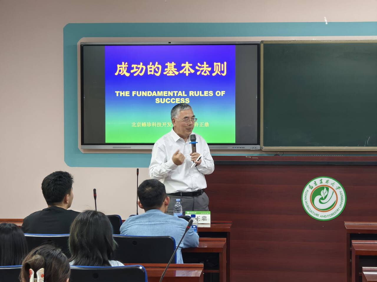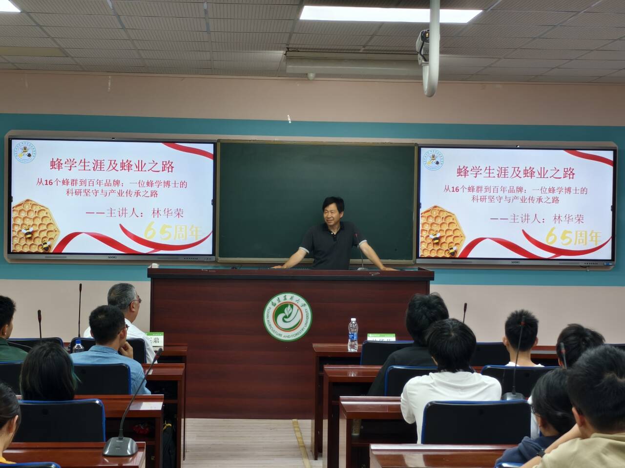 许正鼎校友凭借其丰富的行业实践,围绕蜜蜂科研、产业发展以及企业管理等方面展开分享。他深入浅出地阐述了蜂胶研究的重要意义及其产业化发展的广阔前景,强调科技创新是推动蜂产业高质量发展的关键动力。此外,许正鼎还就“成功的定义”“衡量标准”以及“实现路径”进行了深刻剖析。他鼓励同学们树立远大理想,明确目标方向,努力成长为具有专业素养和社会责任感的新时代蜂学人才。