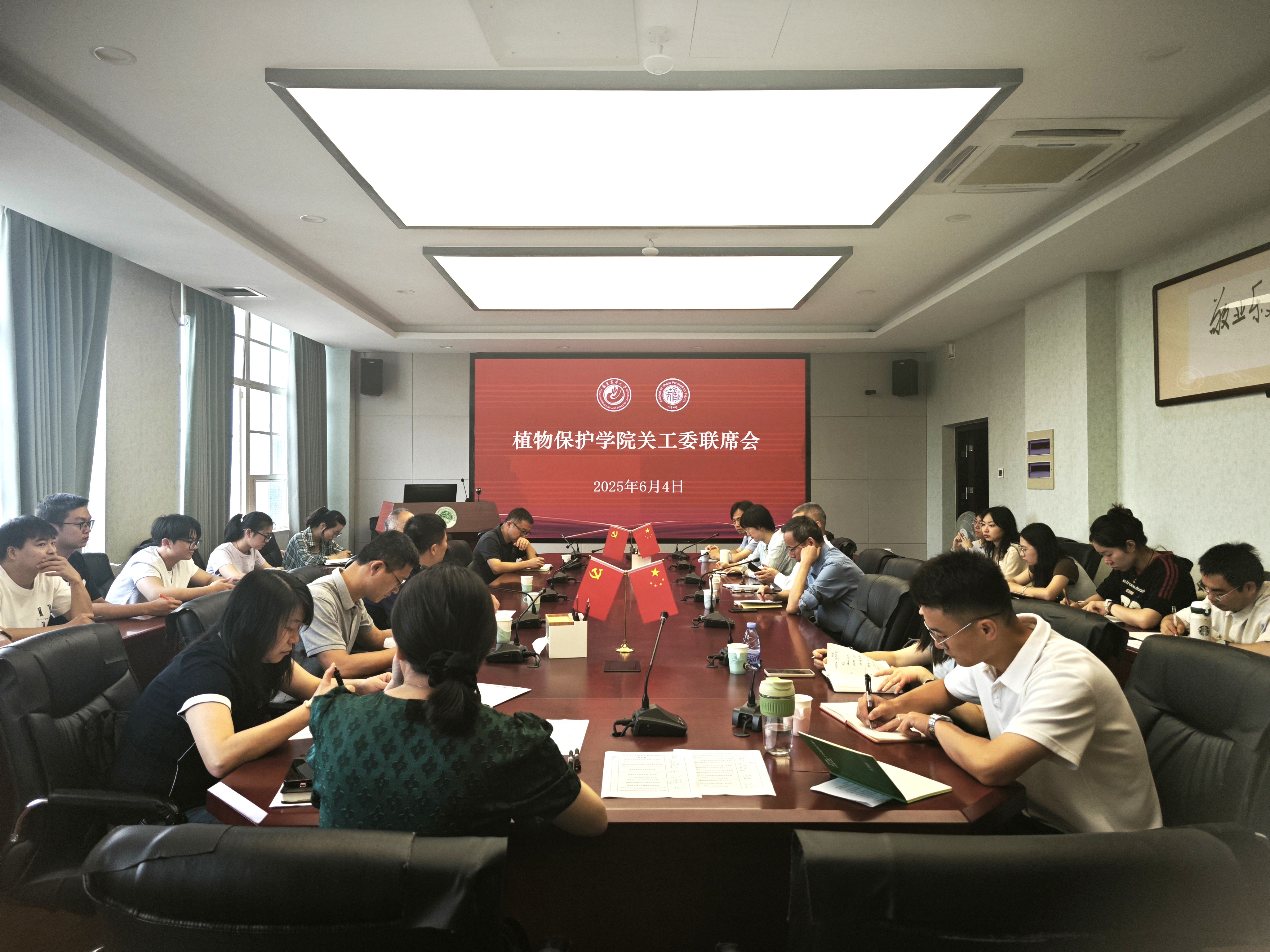 6月4日上午,植物保护学院在博学楼703会议室召开2025年度关工委联席会议,深入学习贯彻习近平总书记关于关心下一代工作的重要指示批示精神,认真落实全国、全省以及学校关工委工作会议精神,研究部署争创校基层“五好”关工委、深入开展“读懂中国”主题教育实践等重点任务。会议由院党委书记沈必胜主持,校关工委副主任、院离退休党支部书记张绍升,院党委副书记、关工委主任陈文滨,副院长肖顺,院关工委主要成员、各党支部书记参加会议。