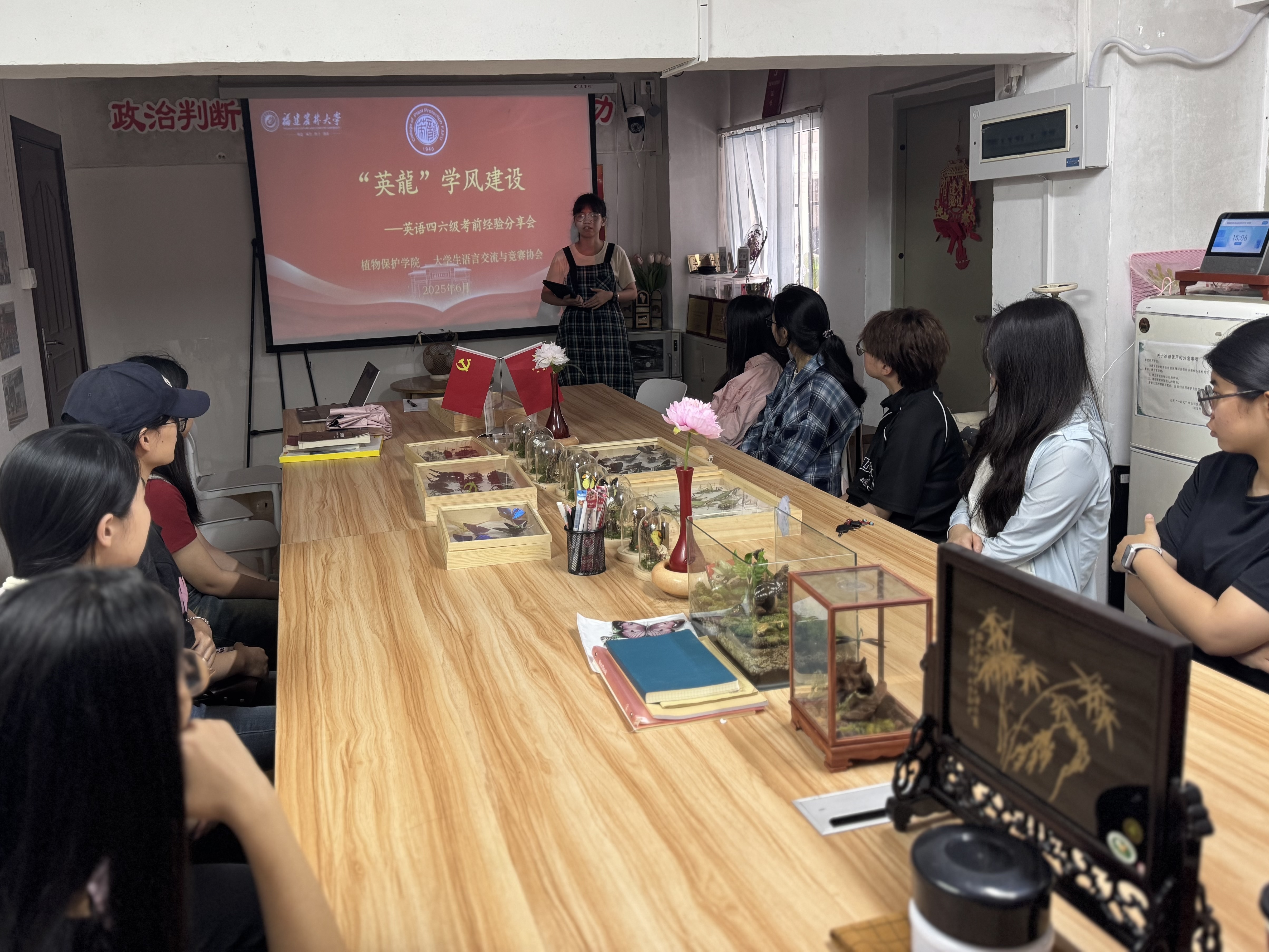 为助力学生高效备考英语四六级,营造浓厚的学习氛围,6月4日下午,植物保护学院大学生语言交流与竞赛协会在青果一站式学生社区举办“英龍”学风建设——英语四六级考前经验分享会。本次活动邀请2021级植物保护专业本科生刘雅诗、2022级植物保护专业本科生何婕绮两位“英语达人”分享备考经验,20余名同学到场聆听,活动由辅导员彭家峰主持。