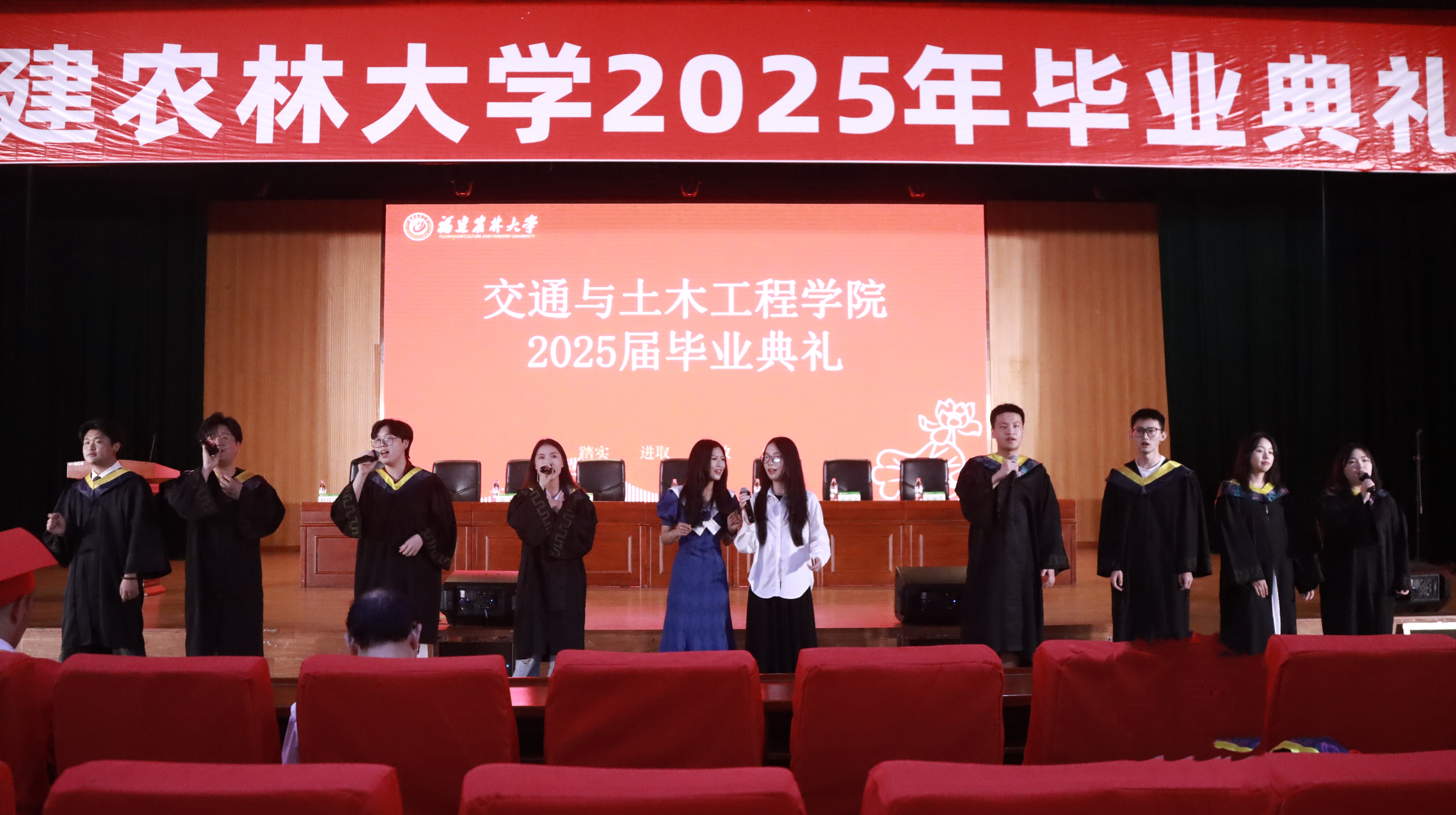 典礼开始前,毕业生代表与老师们深情合唱《那些喊给天空的》《那些年》《你曾是少年》等歌曲,展现了交院师生的蓬勃朝气。