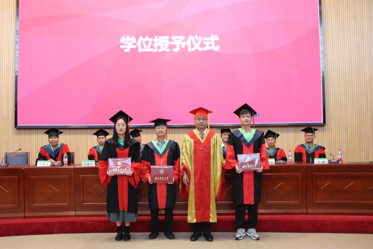 在学位授予仪式中,学位评定委员会学院分委会成员为毕业生颁发学位证书,扶正流苏,并合影留念。