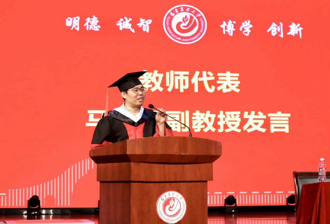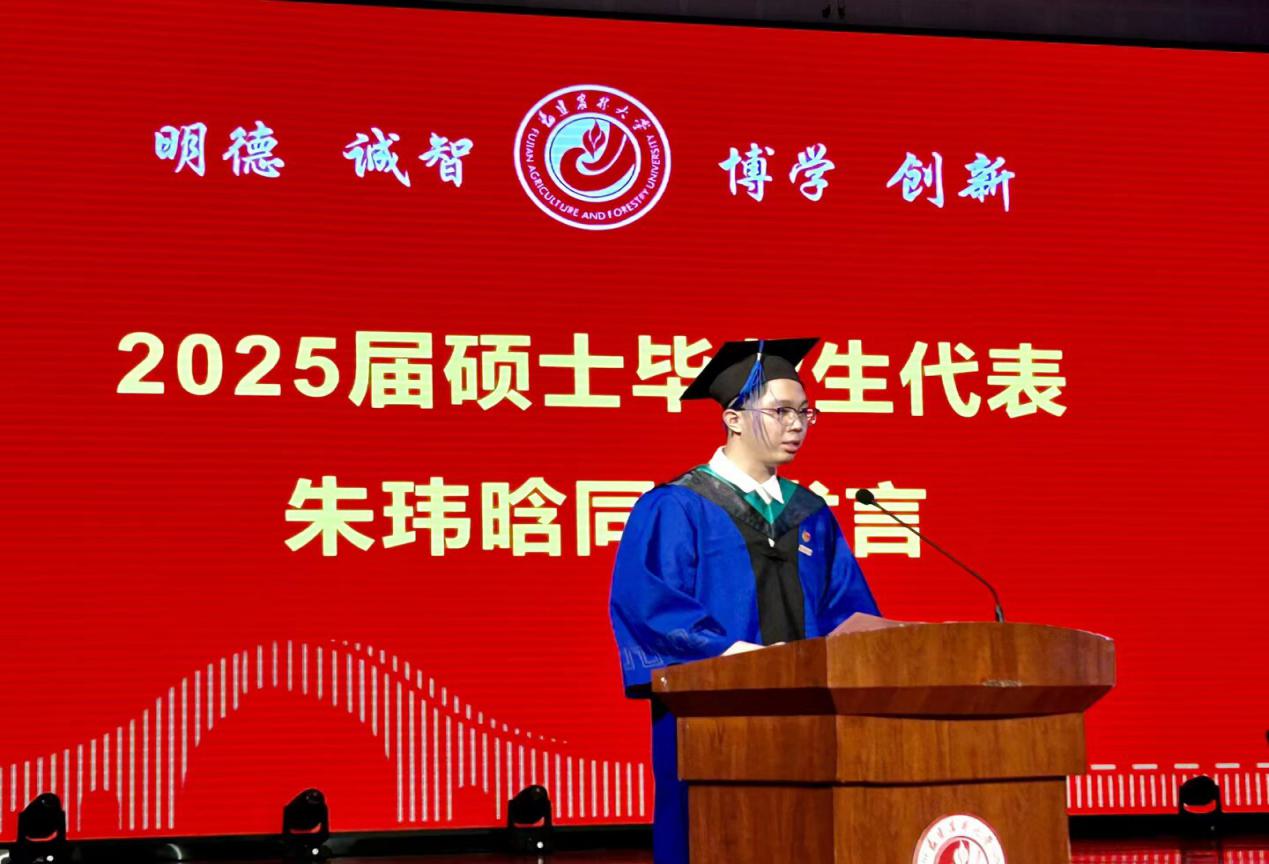 2022级农业管理专业全日制硕士研究生、优秀毕业生代表朱玮晗代表毕业生们向母校、老师和亲友们表达了最诚挚的感谢,他表示学院是他梦想的摇篮,在这里他学会了以天下为己任的担当,领悟到了以真理为追求的真谛。