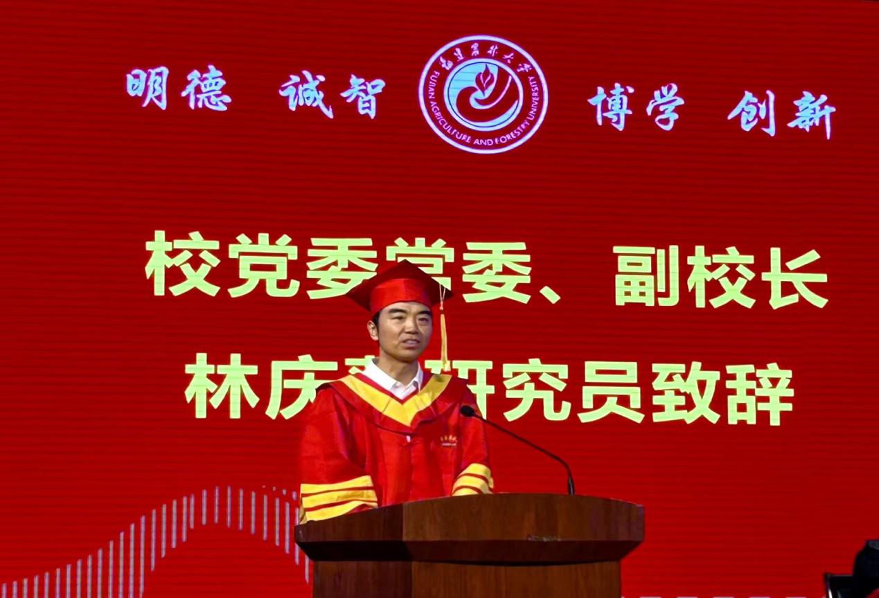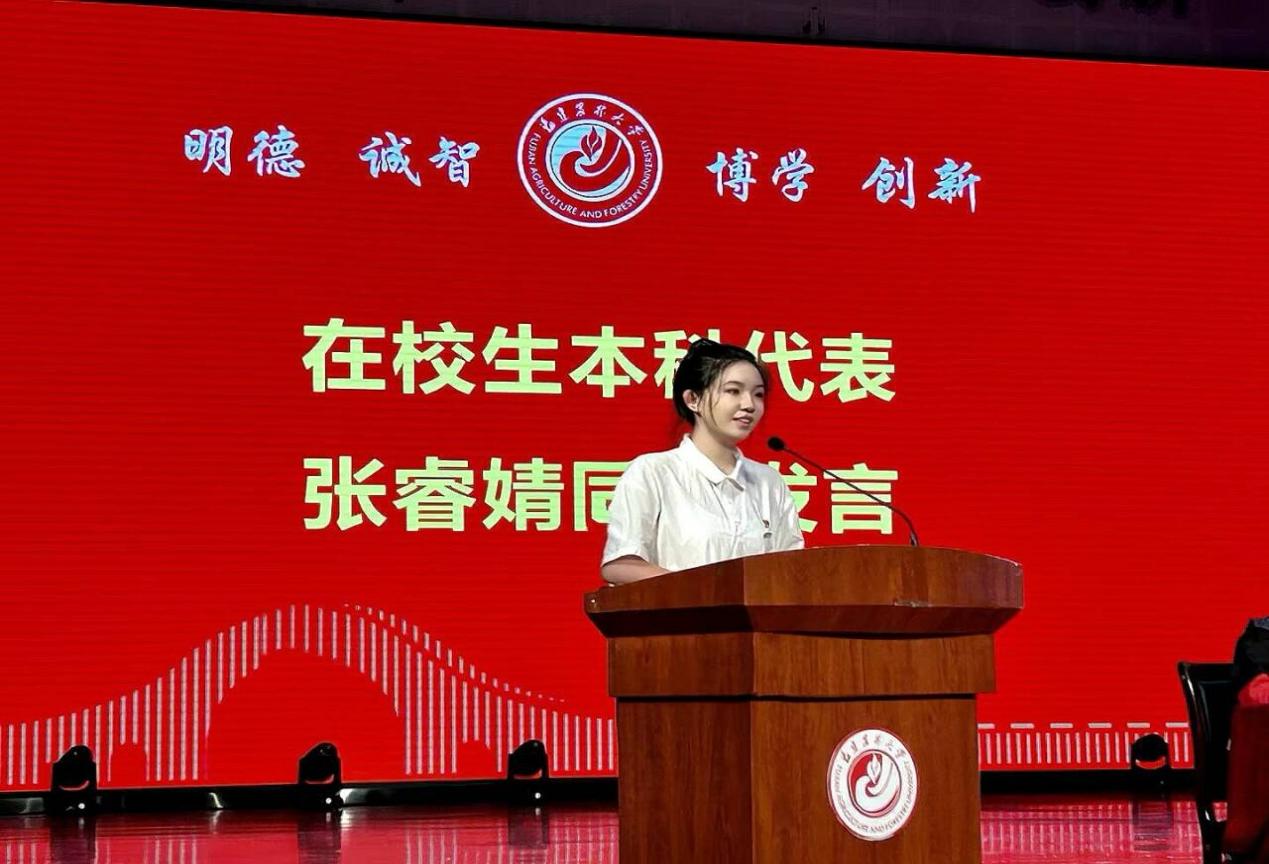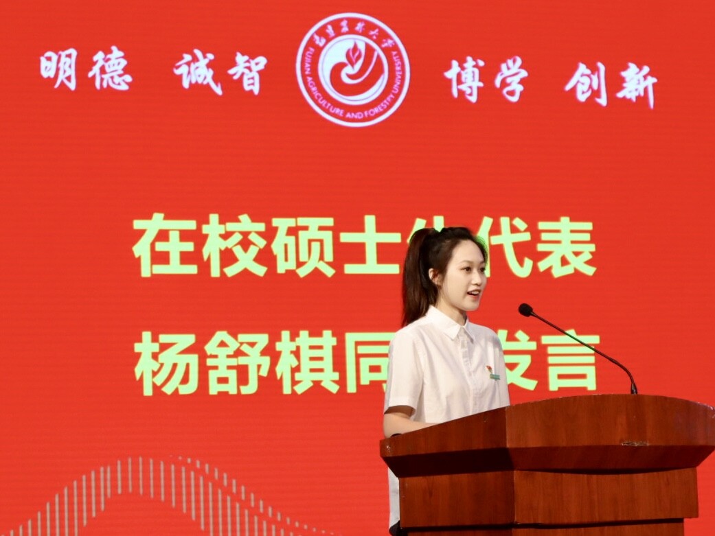 2023级农业管理专业全日制硕士研究生、在校学生代表杨舒棋在发言中向即将毕业的学长学姐致以衷心祝愿,表示未来将以学长学姐们为榜样,继续践行“明德、诚智、博学、创新”的校训精神,传承“耕牛的拓荒品格、骏马的争先品格、蜜蜂的勤勉品格、青松的顽强品格、小草的奉献品格”五种品格,书写福农进步发展的新篇章。