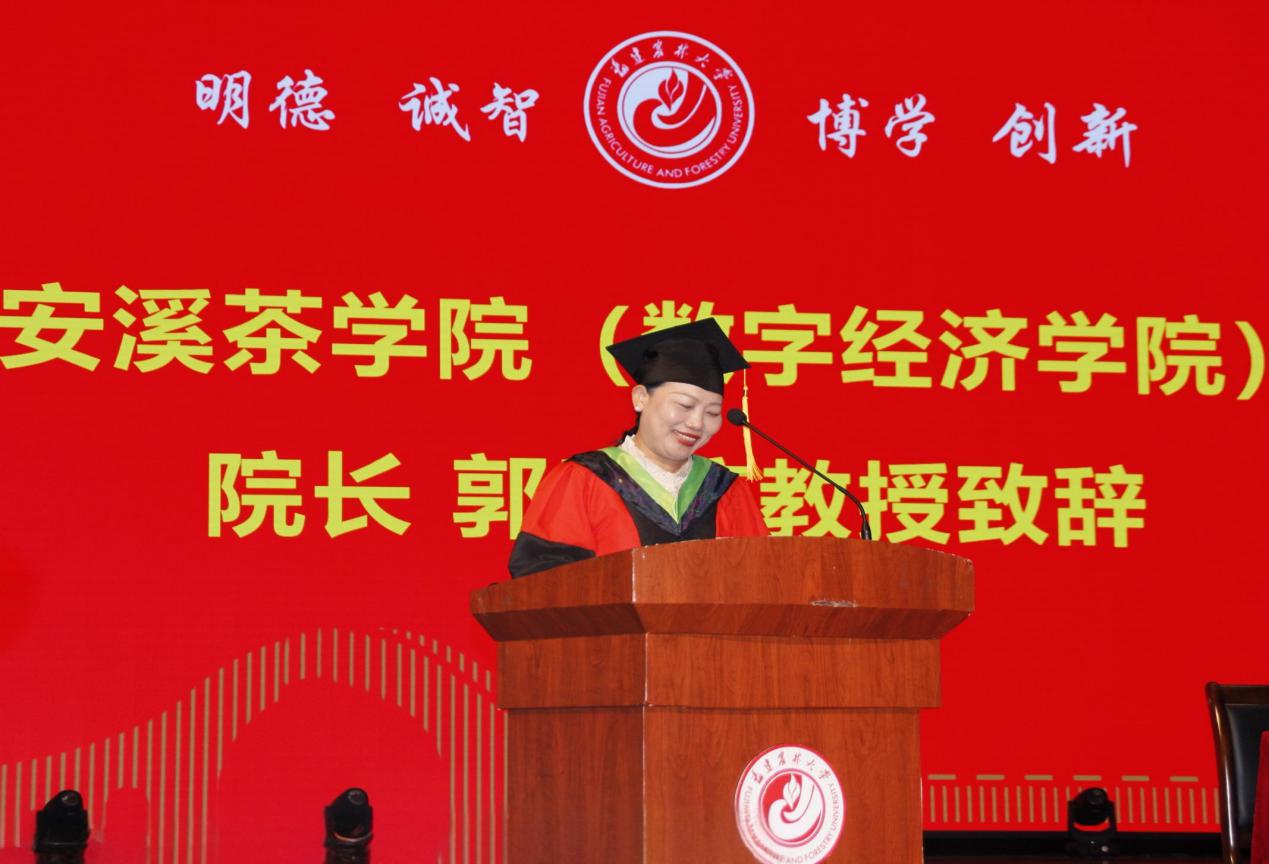 院长郭玉琼在讲话中深情回顾了毕业生们在学院四年成长的点滴,并对他们寄予厚望。她希望同学们一是行路有风浪,当以初心为舵,逆水行舟时,要永葆初心;二是做躬身入局者,不做岸上观潮人,只有跳进时代的激流,才能捕捉真实的浪花;三是行人需秉烛,莫惧夜长道阻,知识是永不熄灭的火把,要保持终身学习的能力;四是逆旅亦风景,行者自成诗,要勇于面对困难,把荆棘之路走成花径。