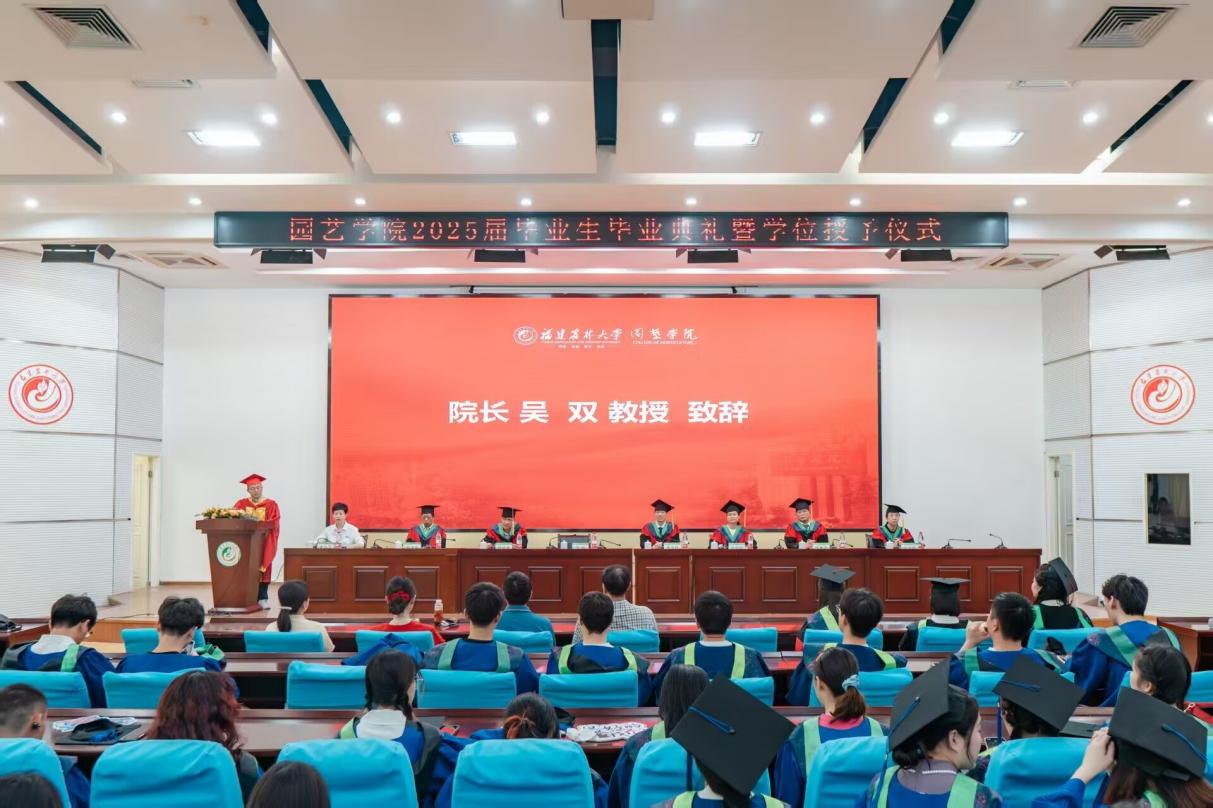 在激昂嘹亮的国歌声中,典礼正式拉开帷幕。院长吴双教授首先发表热情洋溢的致辞,他深情回顾了2025届园艺学子的成长历程,向辛勤耕耘的全体教师和默默支持的家长致以崇高的敬意,并向圆满完成学业的毕业生们表示最热烈的祝贺。吴双以“园艺三喻“勉励全体毕业生:一要如“乔木”般扎根大地,将个人理想融入国家乡村振兴战略;二要似“园林”般包容万物,以开放胸襟面对人生挑战;三要若“繁花”般永葆生机,在服务社会中绽放青春光彩。