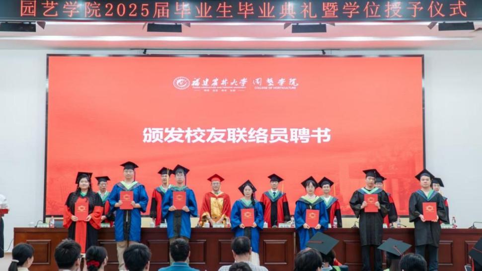 副院长曾黎辉宣读园艺学院2025届校友联络员名单,主席台领导为联络员颁发聘书,期待他们构筑起母校和校友间情感互通、信息共享的坚实纽带。
