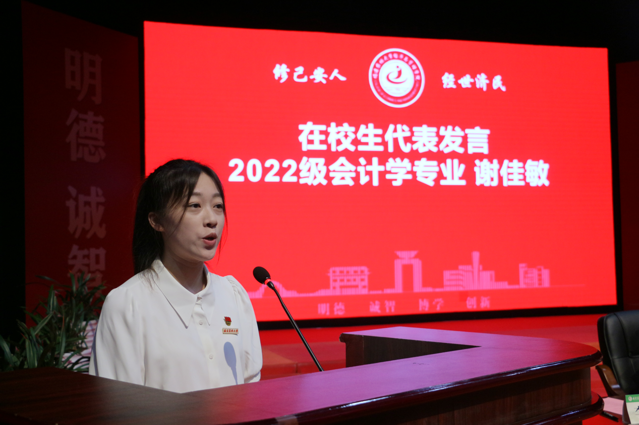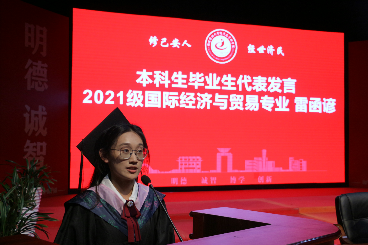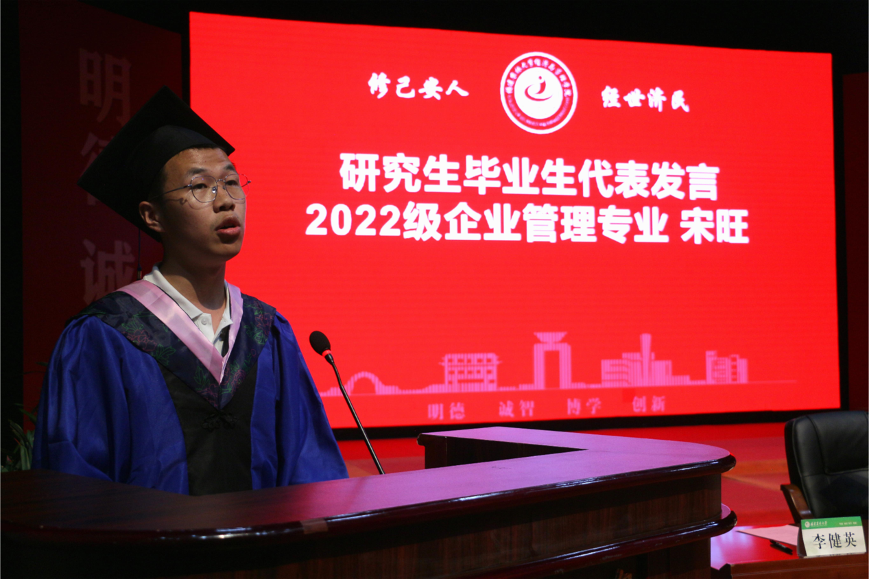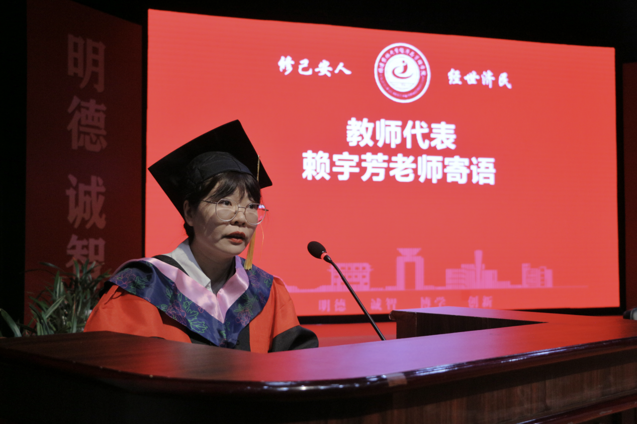 教师代表赖宇芳老师勉励毕业生们要永葆求知热忱、坚守初心使命,在人生新征程中以奋进之姿书写无悔答卷。校友代表学院泉州校友会会长黄志源和家长代表王芝茹先后发言,祝福毕业生们一路繁花相伴,在未来续写属于自己的璀璨诗篇。研究生毕业生代表2022级企业管理专业宋旺、本科毕业生代表2021级国际经济与贸易专业雷函谚依次发言,对母校悉心培育、老师谆谆教导、同学相互陪伴以及父母默默支持表达了由衷感谢。在校生代表2022级会计学专业谢佳敏向即将离校的学长学姐们表达了深切祝福,表示将以毕业生为榜样,传承学院优良学风。