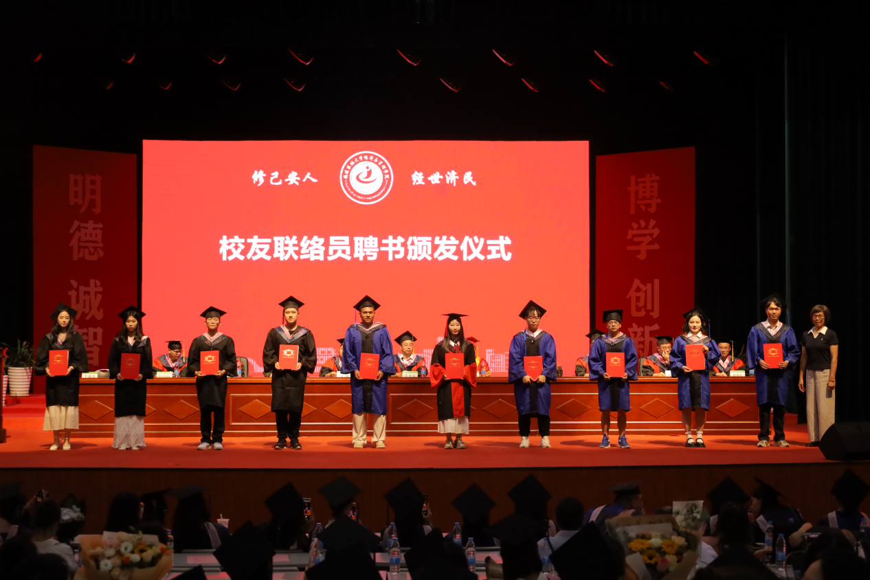 院党委书记张开晃宣读了2025届校友联络员及院优秀毕业生名单,主席台上领导为获奖的优秀毕业生颁发荣誉证书,院校友会秘书长黄怡老师为校友联络员颁发聘书。
