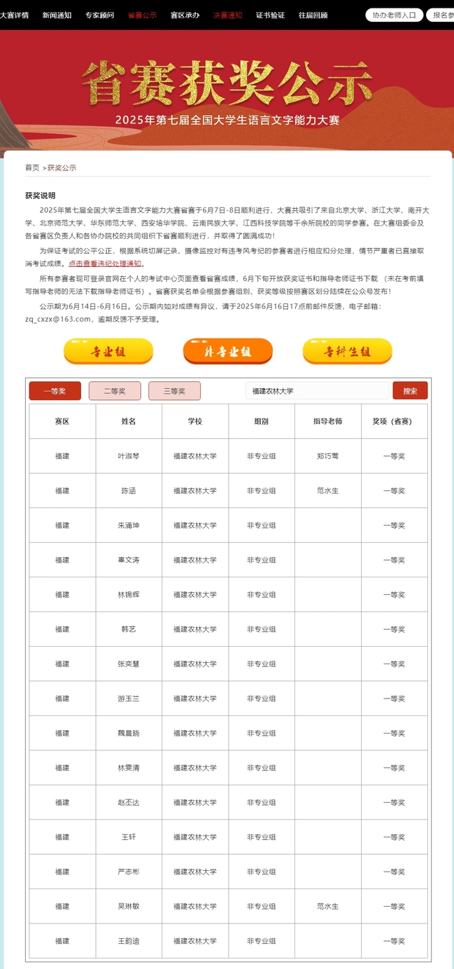 日前,2025年第七届全国大学生语言文字能力大赛福建省省赛圆满落下帷幕,本次赛事吸引了厦门大学、福州大学、福建师范大学、华侨大学等省内十余所高校学子参与。作为大赛协办单位,我校首次组织学生集体参赛,即在非专业组全省决赛中荣获佳绩,取得一等奖15项,二等奖26项,三等奖47项。