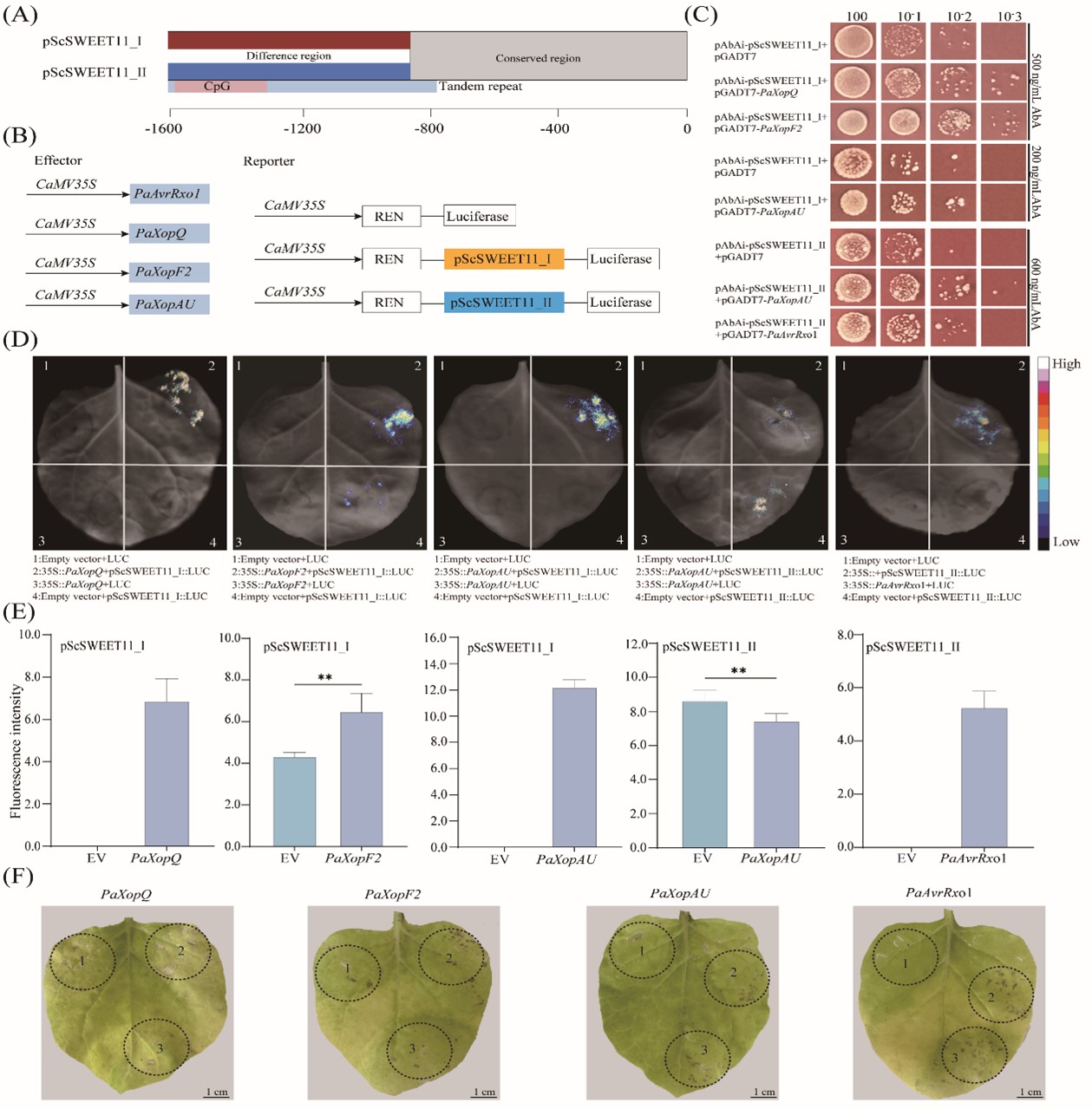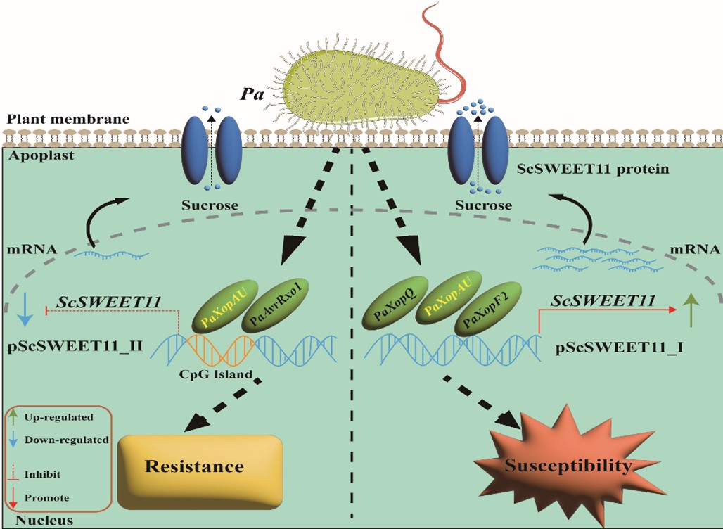 甘蔗是一种高光效的C4植物,因茎秆富含大量糖类物质而著名,成为全球最重要的糖料和生物能源作物。由Paracidovorax avenae (Pa )引起的赤条病是一种严重危害甘蔗叶片的细菌性病害。前期研究显示,糖外排转运蛋白(Sugars Will Eventually be Exported Transporter, SWEETs)家族基因参与响应甘蔗与Pa的互作,但机制尚不清晰。本研究中,过表达ScSWEET11植株,接种Pa后的病斑面积显著增大,异源表达ScSWEET11的酵母糖转运突变体,恢复了蔗糖转运活性。进一步,克隆了甘蔗栽培品种中该基因的启动子序列,其中pScSWEET11_I来自甘蔗属割手密种,而pScSWEET11_II来自甘蔗属热带种,且感病品种为杂合类型,相反地,抗病品种仅有pScSWEET11_II。在脱落酸与Pa胁迫下,pScSWEET11_I的活性都显著强于pScSWEET11_II。同时,赤条病菌的5个效应因子(PaAvrRxo1, PaXopQ, PaXopF2, PaXopAU,和PaXopAC)的过表达,均能诱导植株产生明显病斑。酵母单杂交、双荧光素酶活性测定和过表达显示,PaXopQ、PaXopAU、PaXopF2调控pScSWEET11_I活性,诱导ScSWEET11表达,加速蔗糖外排,导致植株感病;而PaAvrRxo1、PaXopAU影响pScSWEET11_II活性,抑制ScSWEET11表达,减弱蔗糖外排,引发植株抗病(图1)。