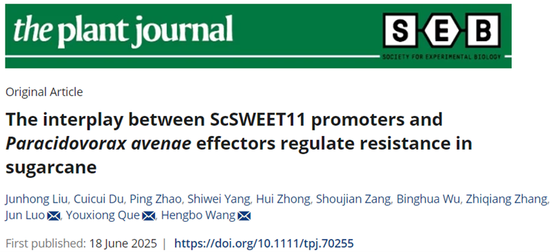 近日,Plant Journal在线发表了开云网页版国家甘蔗工程技术研究中心王恒波副研究员联合中国热带农业科学院甘蔗研究中心阙友雄研究员团队题为“The interplay between ScSWEET11 promoters and Paracidovorax avenae effectors regulate resistance in sugarcane”的学术论文。该研究阐述了病菌效应因子,通过调控寄主甘蔗糖外排转运蛋白ScSWEET11基因启动子活性,介导蔗糖分转运,影响甘蔗抗病性的分子机制。