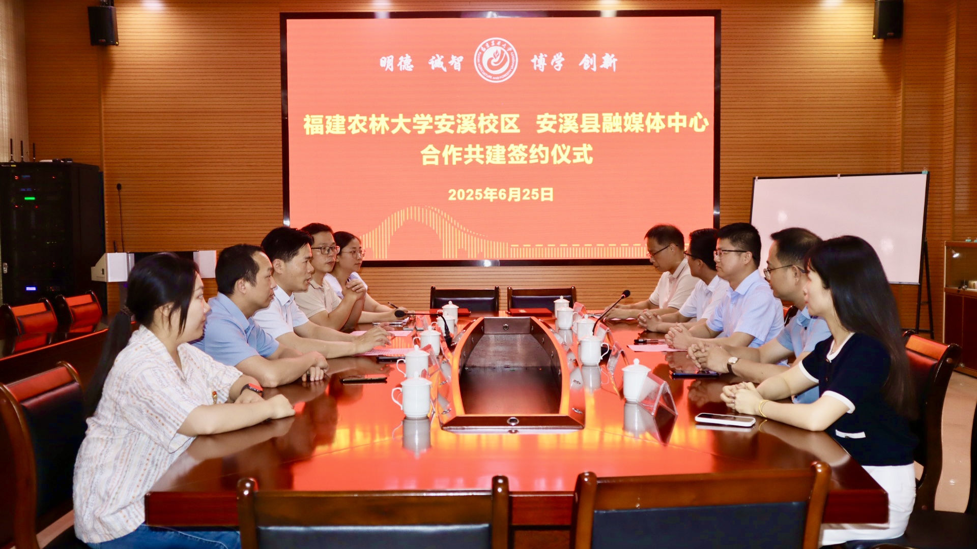 黄成茂代表学院对安溪县融媒体中心林清锻一行的莅临表示热烈的欢迎,他指出,此次校媒党建共建签约,对于推动产学研深度融合,提升人才培养质量与社会服务能力具有十分重要的意义。他提出三点合作愿景,一是锻造“红色引擎”,以联办主题党日、深挖红色资源、共上“行走的党课”为抓手,筑牢共建根基;二是贯通“育才之路”,通过为学生提供专属实习岗位及骨干导师“手把手”带教,联合举办技能大赛等方式让学生在“讲好安溪故事”中锤炼“四力”,共育懂农业、爱农村、有传媒本领的复合型人才;三是激活“创新密钥”:依托共建基地,将校区茶科技成果转化为融媒体“可视化产品”,共塑文化名片,围绕铁观音品牌升级等课题联合策划报道,助推产业升级,传播校区发展蓝图,共创校地共荣“党建样板”。
